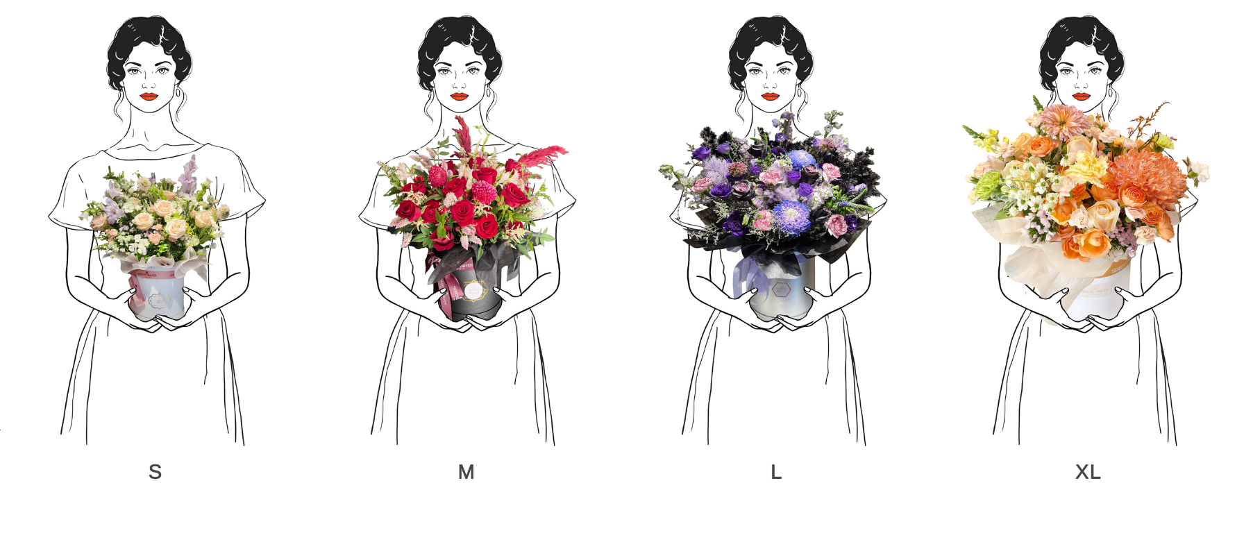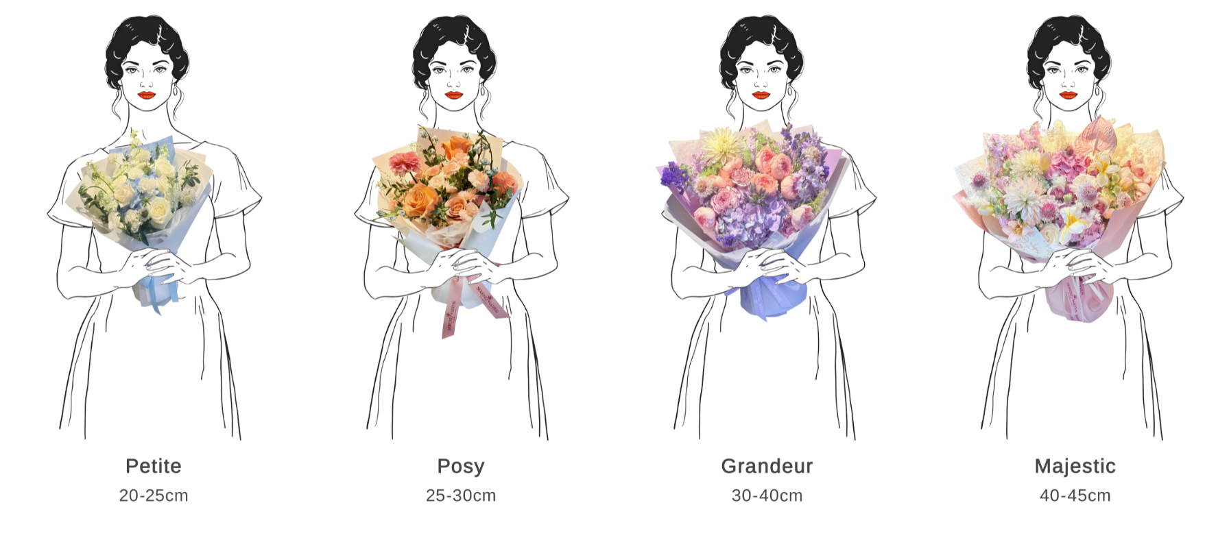 *All size guide illustrations are for reference only - as each bouquet and flower box is handcrafted, measurements are approximate.