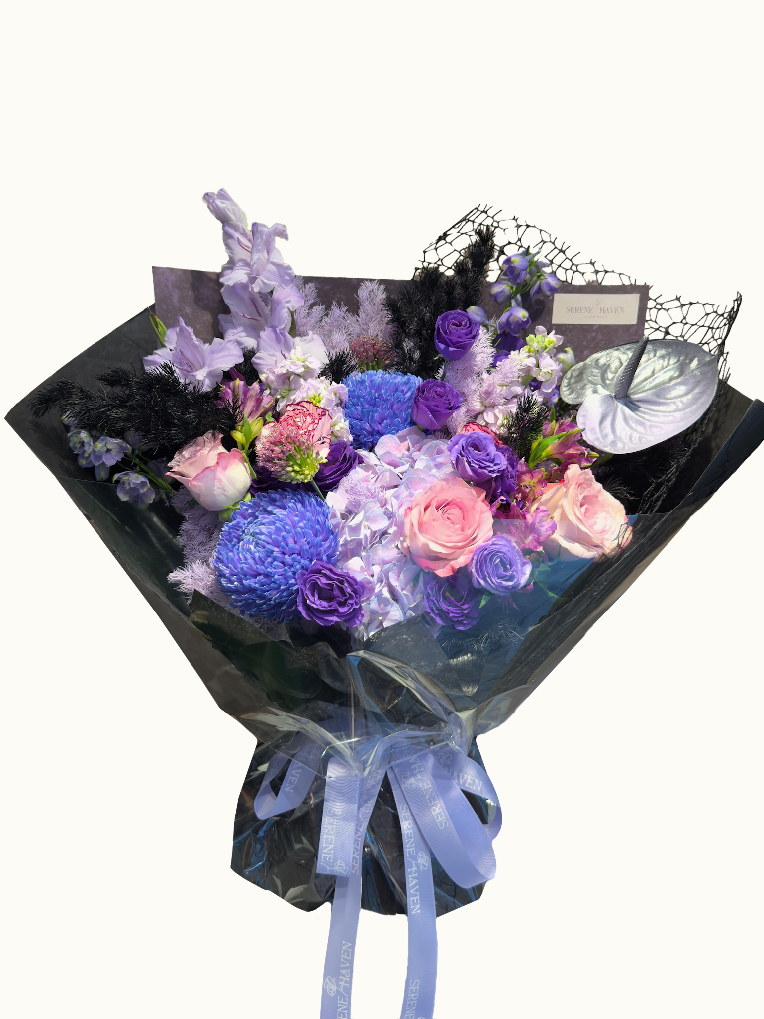 A bouquet in shades of lilac, violet, and twilight blue - an echo of the aurora that never arrives. It speaks of longing, of journeys untaken, yet also of the quiet strength to move forward. An ideal gift for dreamers, achievers, and new beginnings, this bouquet carries the spirit of hope and resilience - a fitting choice for milestones like business openings, celebrations, or any moment that calls for strength and beauty.