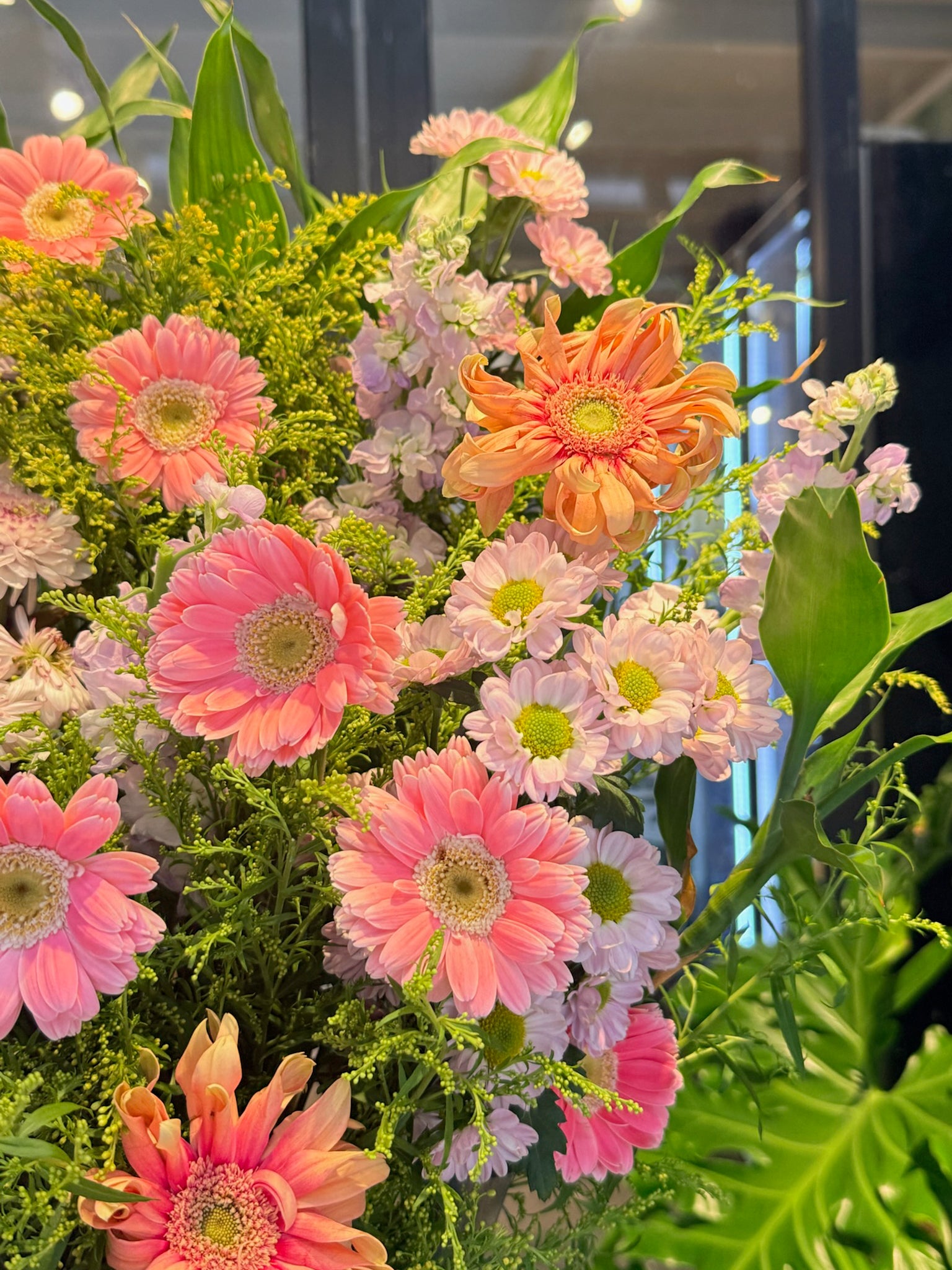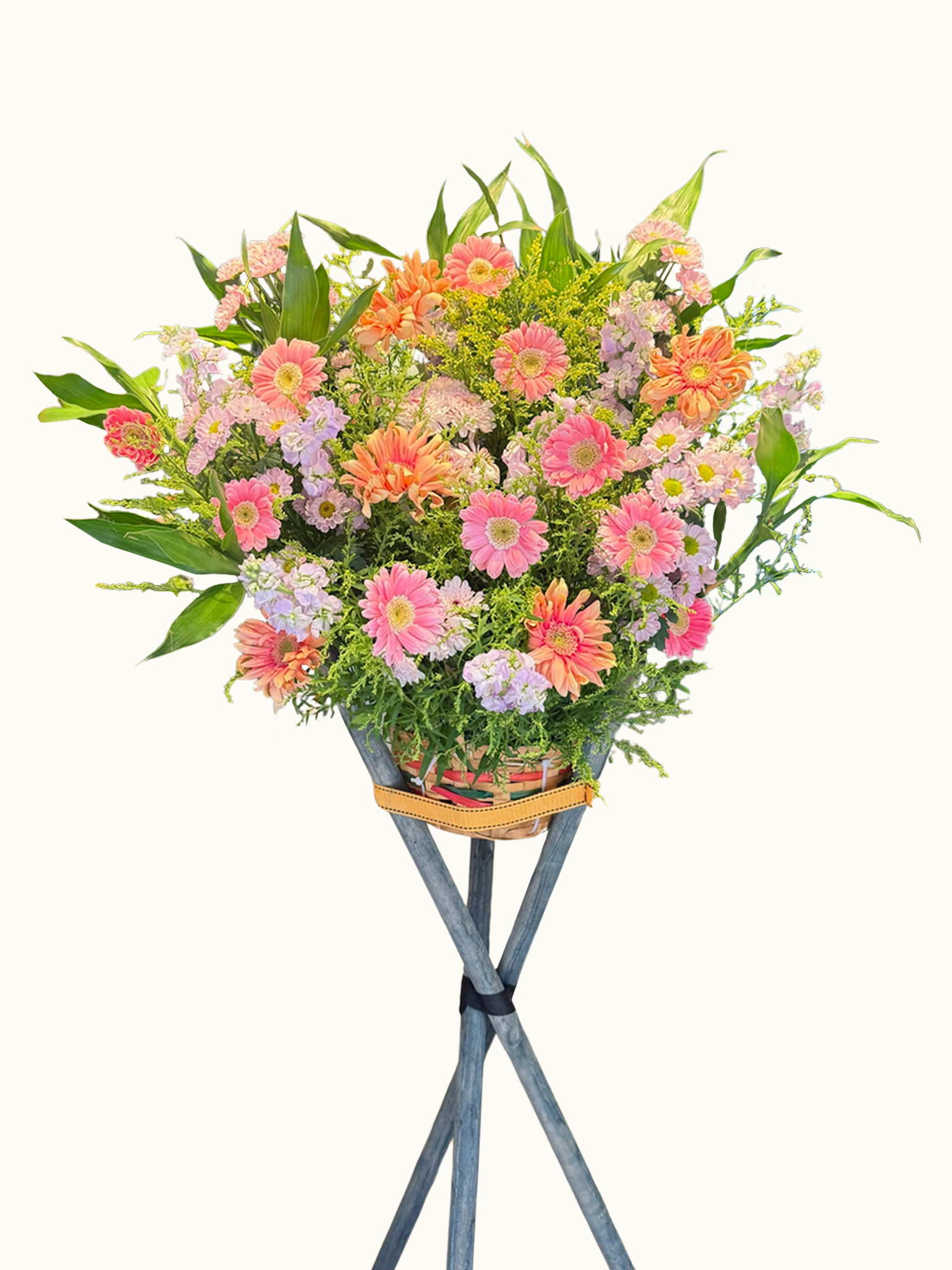 Soft yet full of presence, Blush Radiance shines in shades of pink and coral, evoking joy, charm, and blooming possibility. With cheerful gerberas and pastel accents, this stand offers a gentle blessing of good fortune and warm beginnings.