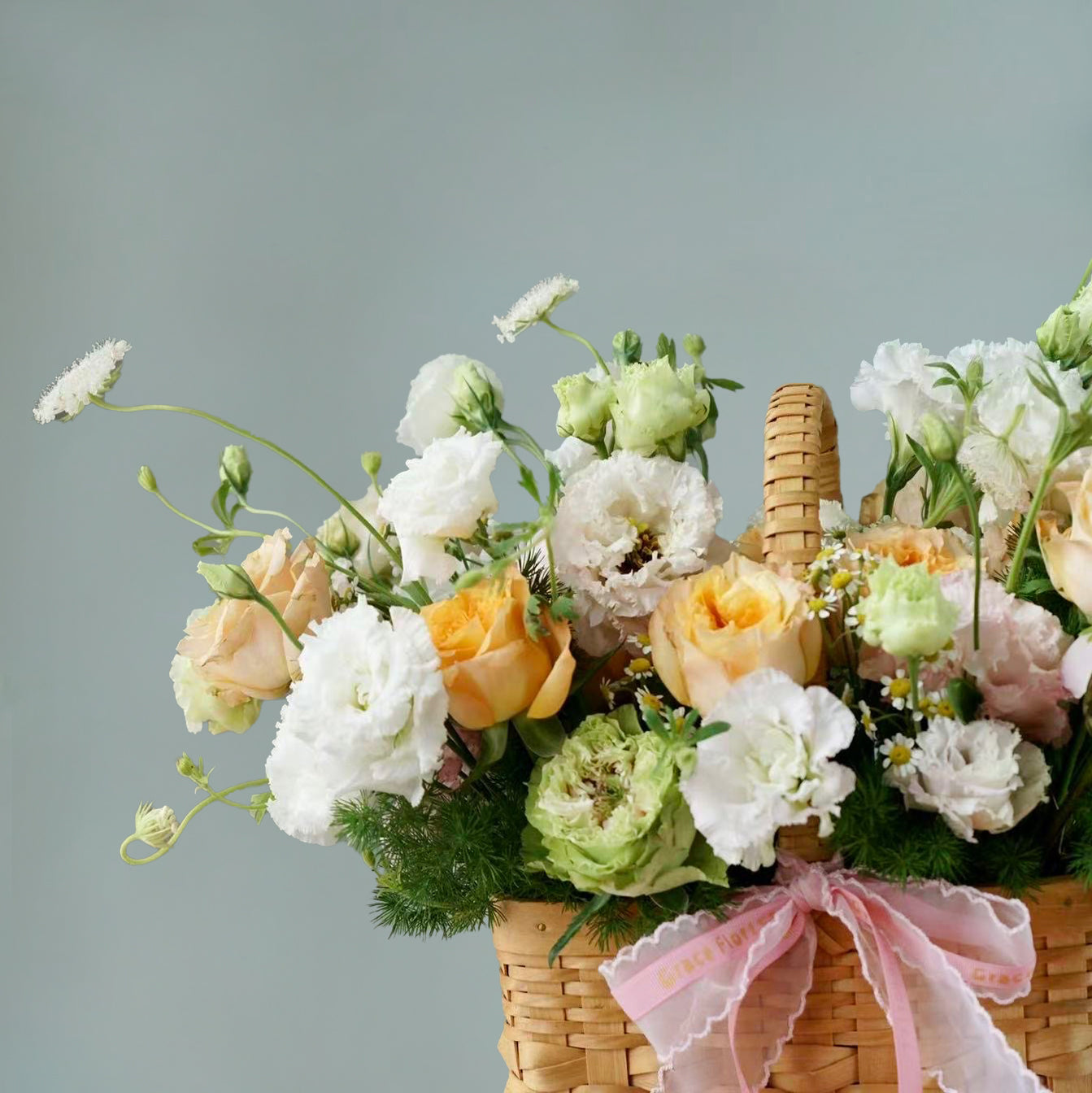 A soft-spoken arrangement that evokes warmth, tenderness, and gentle joy. With its airy composition and pastel palette, this basket brings a calming presence to any setting - whether it’s a serene addition to your living space, a thoughtful gift, or a moment of quiet celebration.