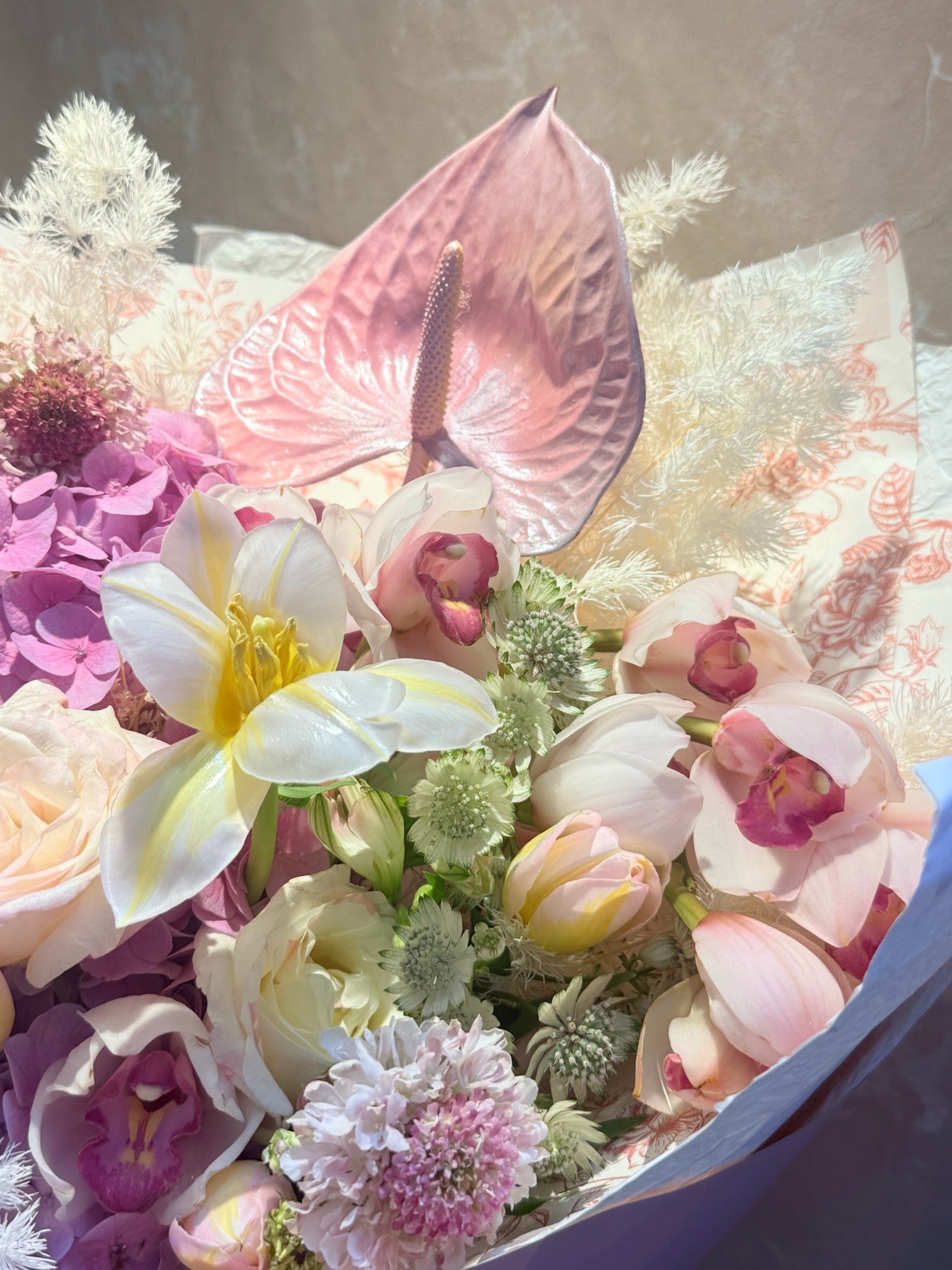 Wrapped in delicate pinks and soft ivory tones, this bouquet feels like a quiet moment shared between hearts. It carries a gentle charm - sweet, serene, and full of affection. Whether it’s a birthday, a romantic surprise, or a thoughtful gesture just because, Blush Whispers speaks in soft tones of love and care. Every petal seems to say: “I’m thinking of you. You’re cherished.”