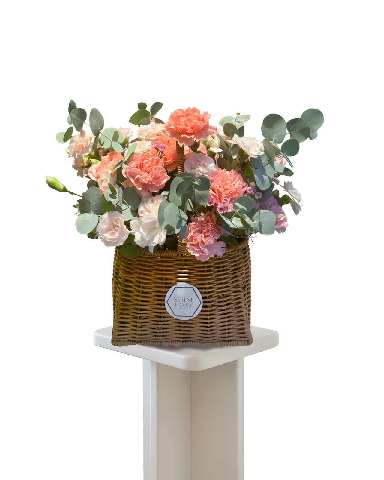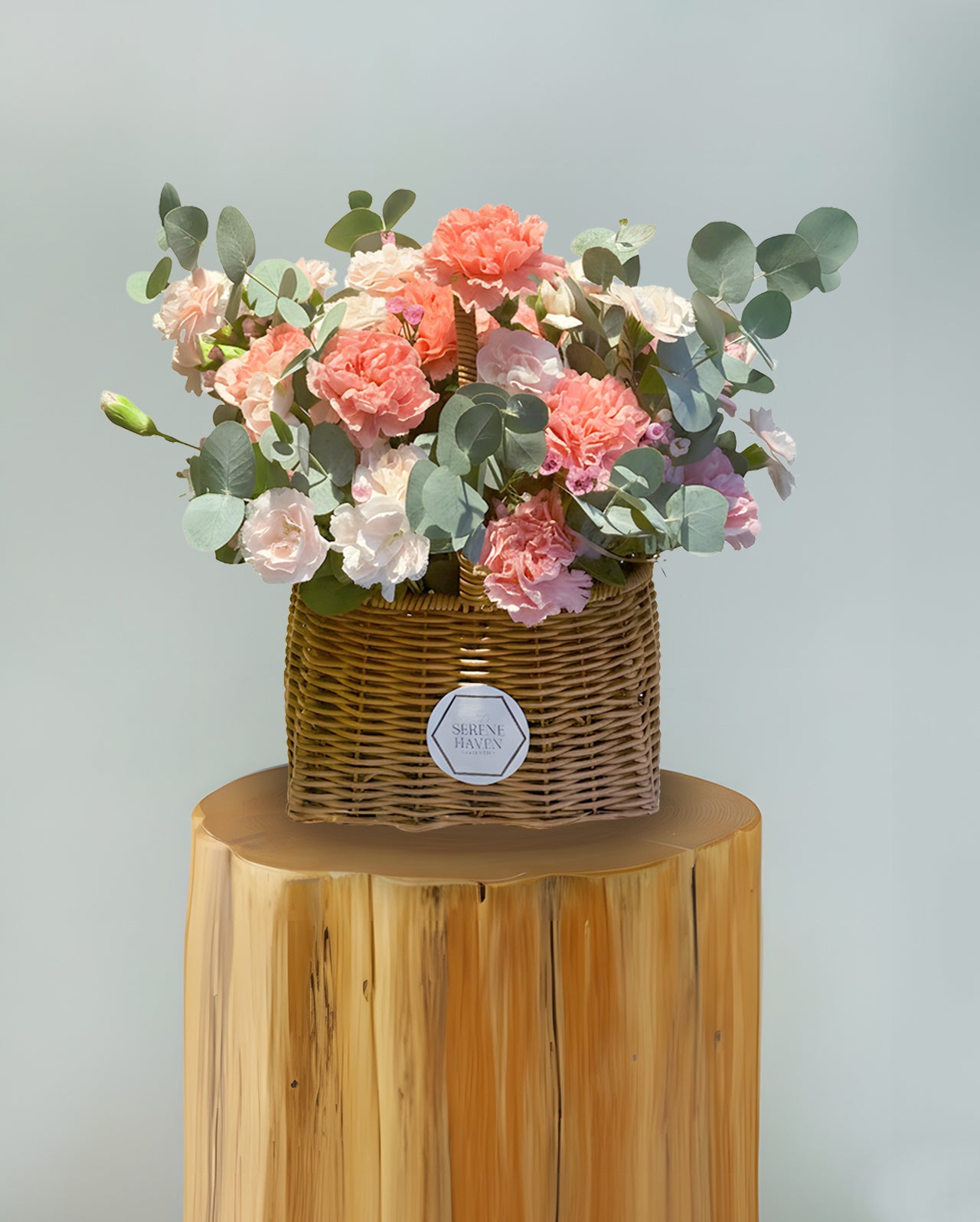 Soft, romantic tones meet lush fullness in this elegant basket of calm and comfort.