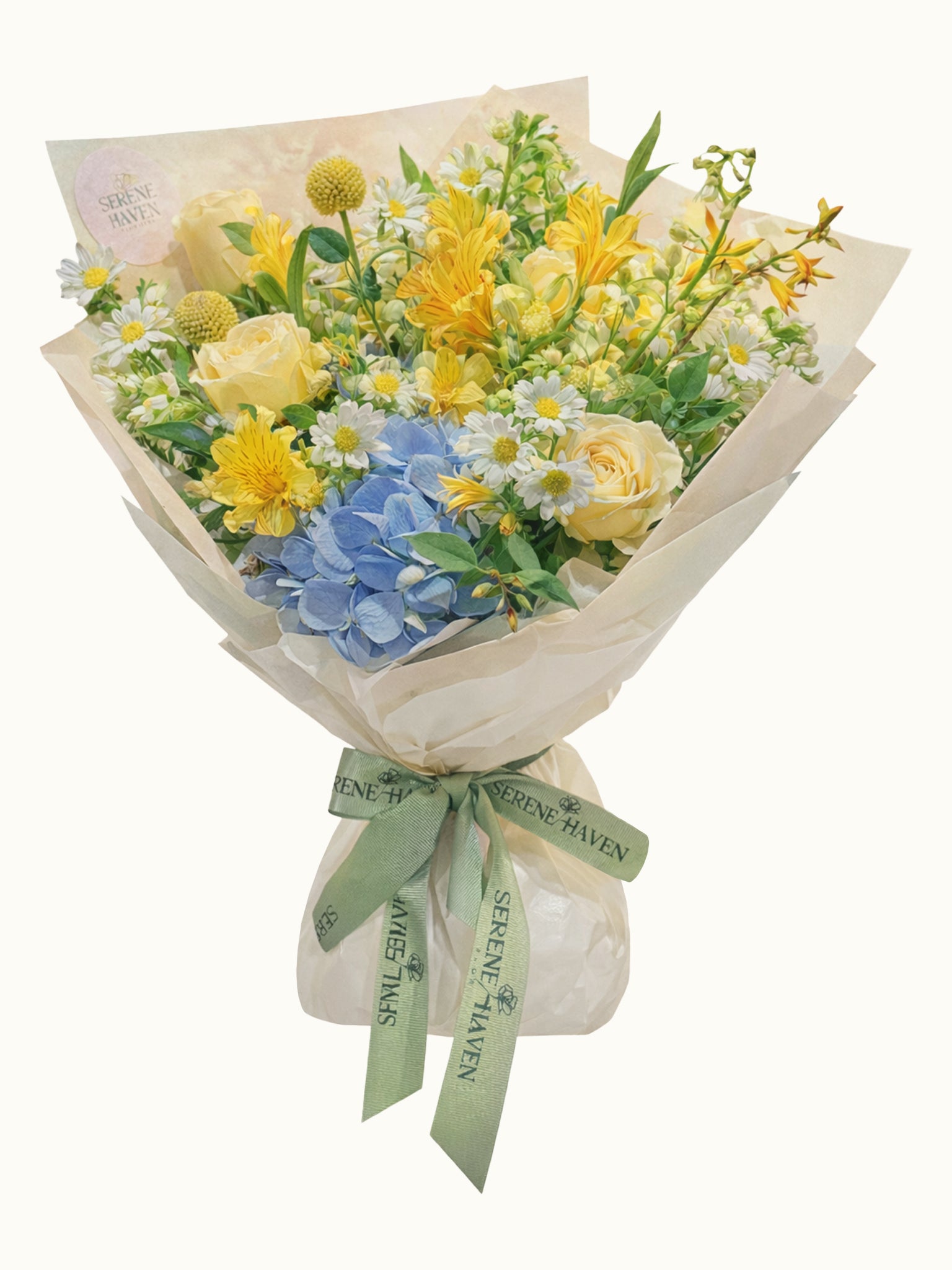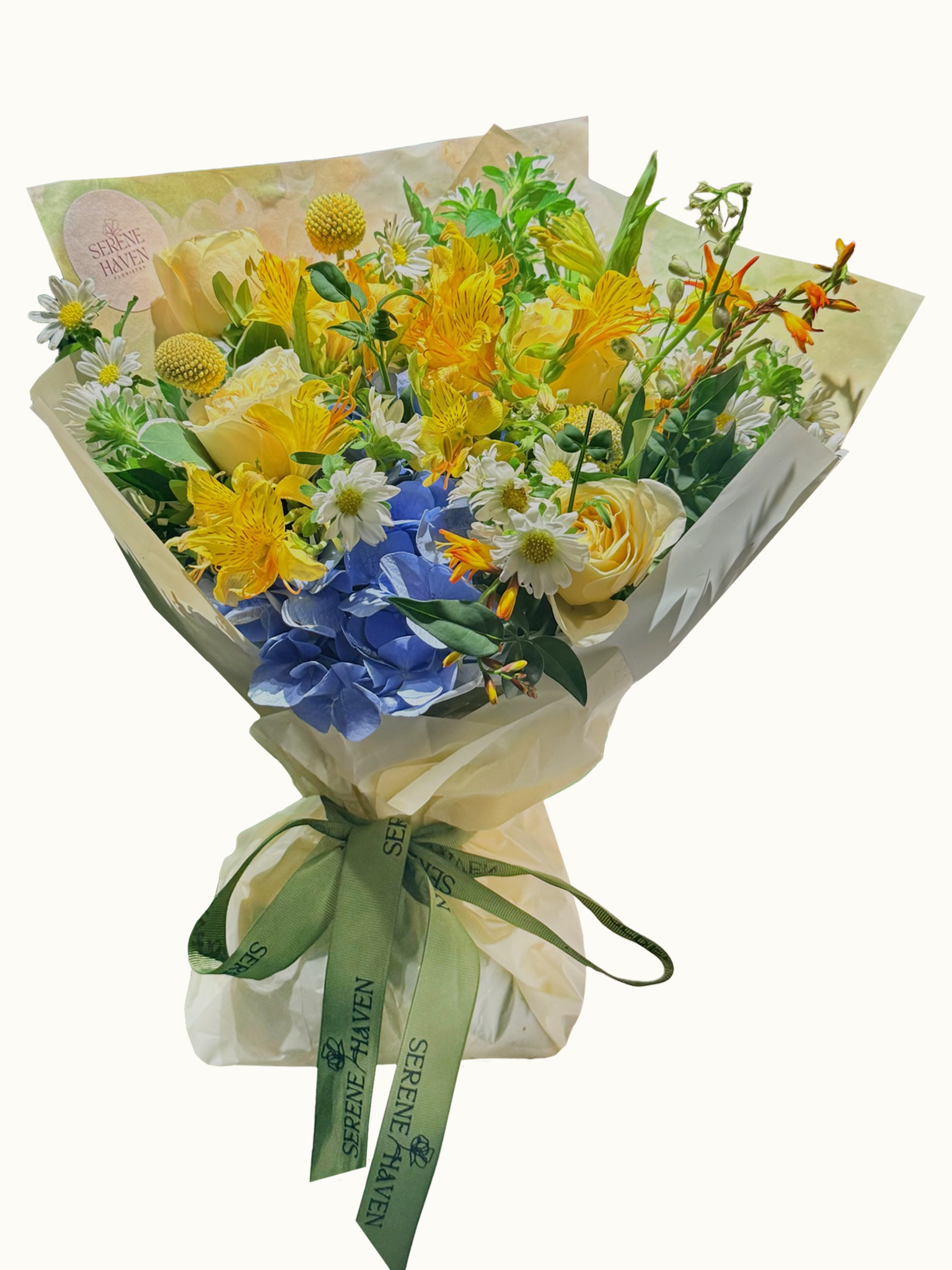 Bright Future is a joyful tribute to milestones achieved and dreams just beginning. Bursting with sunshine-yellow blooms, calming whites, and a bold touch of blue, this bouquet reflects the courage, hope, and happiness that come with stepping into a new chapter.