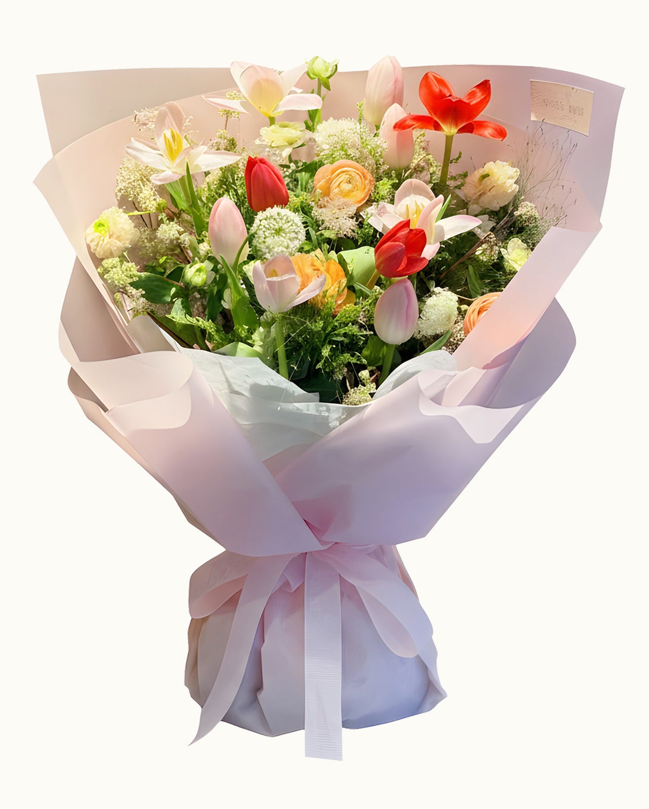 A joyful burst of energy and color, this bouquet is like laughter in bloom. With its cheerful mix of blush tones and playful rhythm, it instantly brightens any room or heart. Perfect for celebrating happy milestones, cheering up a loved one, or sending a lighthearted "thinking of you," it radiates affection with a touch of whimsy. This is the arrangement you send when you want to spread joy - to a best friend, a beloved family member, or anyone who brings a smile to your face.