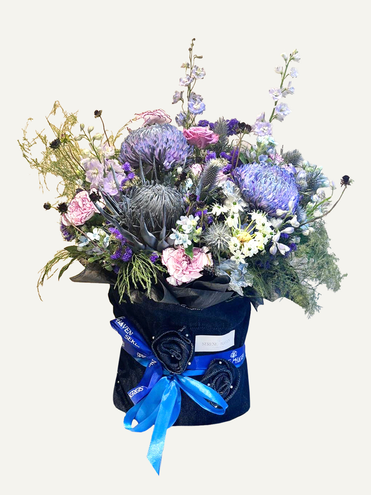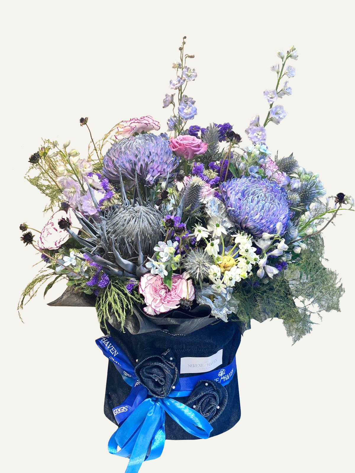 Chapter of the Night Veil unveils a sophisticated blend of deep purples, soft pinks, and muted greens - a palette that evokes the quiet elegance of twilight. Featuring striking textures and blooms like thistles, carnations, and delphiniums, this arrangement is elevated by subtle white accents and lush foliage that add dimension and calm.