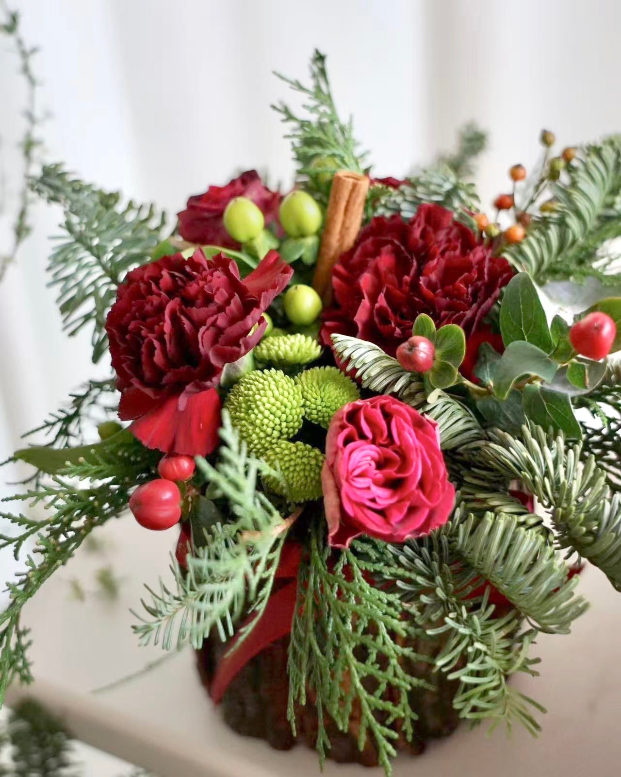 Celebrate the season with natural charm in our Christmas Log Workshop. Guided by our florists, you’ll create a woodland-style festive centerpiece using fresh winter greens, rich textures, and cozy seasonal accents — perfect for your holiday table or gifting with love.