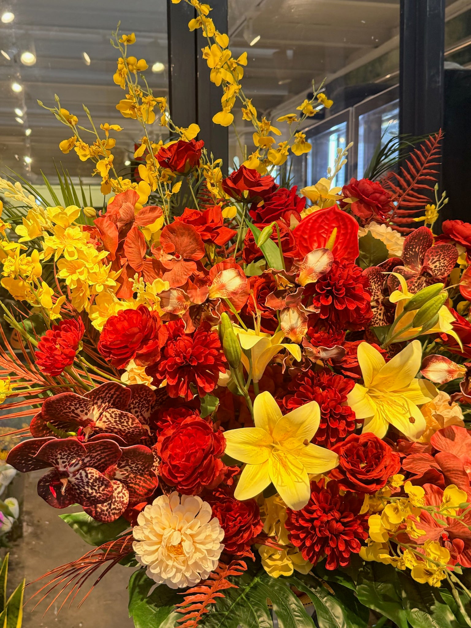 Fierce and unforgettable, Ember Bloom blazes in a dramatic mix of crimson, scarlet, and gold. With exotic orchids, fiery anthuriums, and bold florals, it commands attention and exudes celebratory fire.