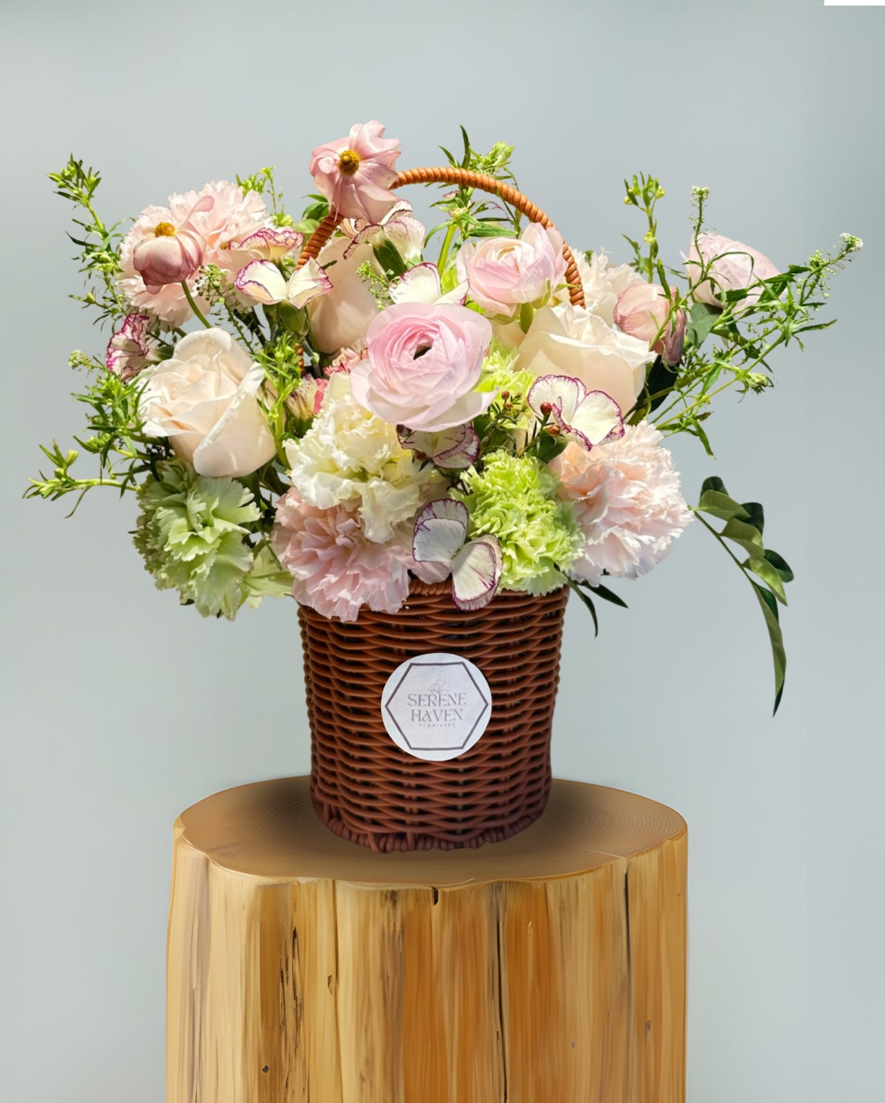 Soft, romantic, and effortlessly charming, Gentle Petals showcases layers of blush and cream blooms accented with fresh greenery in a relaxed garden-style arrangement. Set in a rustic wooden-style basket, the design feels light and graceful, celebrating the natural beauty of each flower.