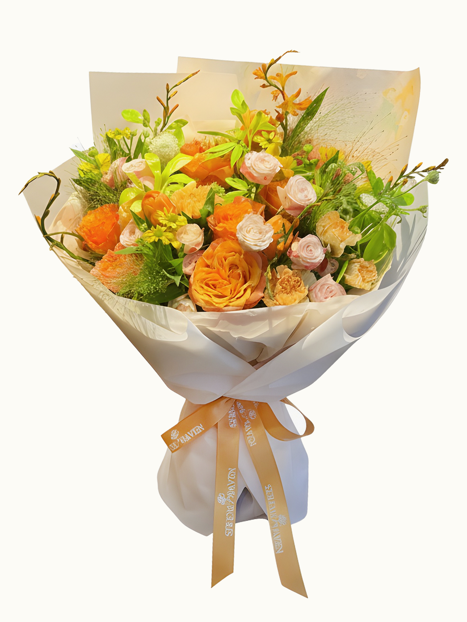 Full of warmth and gentle vibrance, this bouquet captures the spirit of golden hour - that quiet, glowing moment between day and dusk. It feels like a warm hug, wrapped in petals and light.