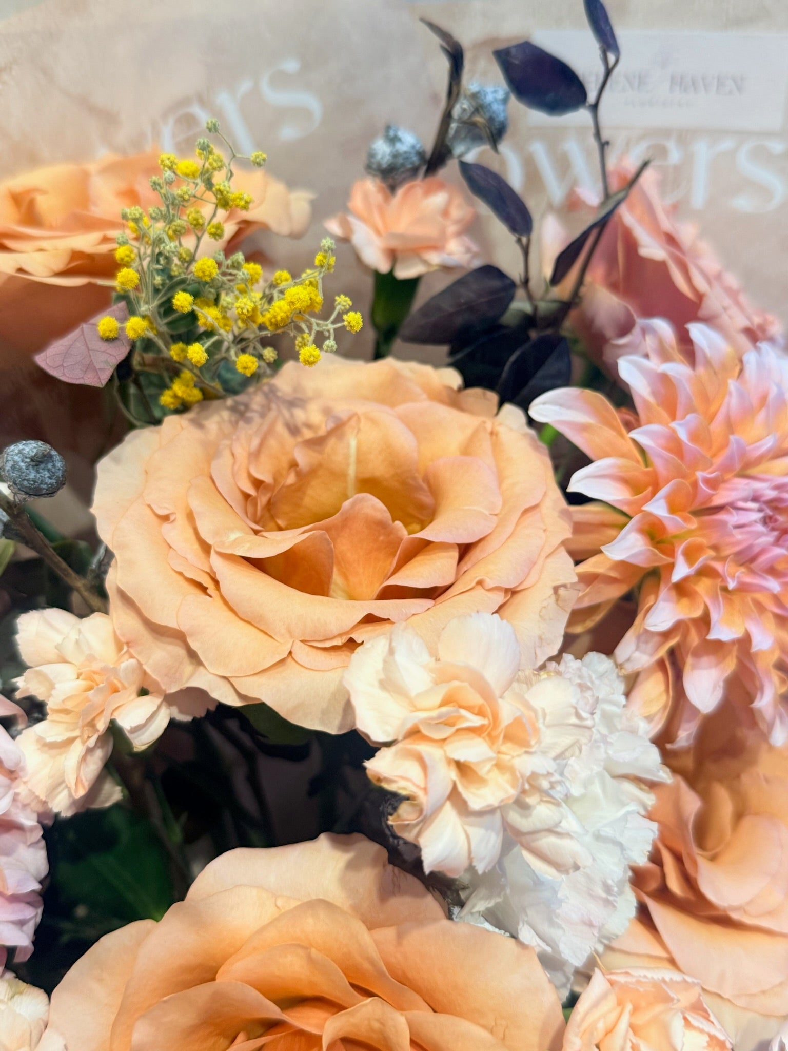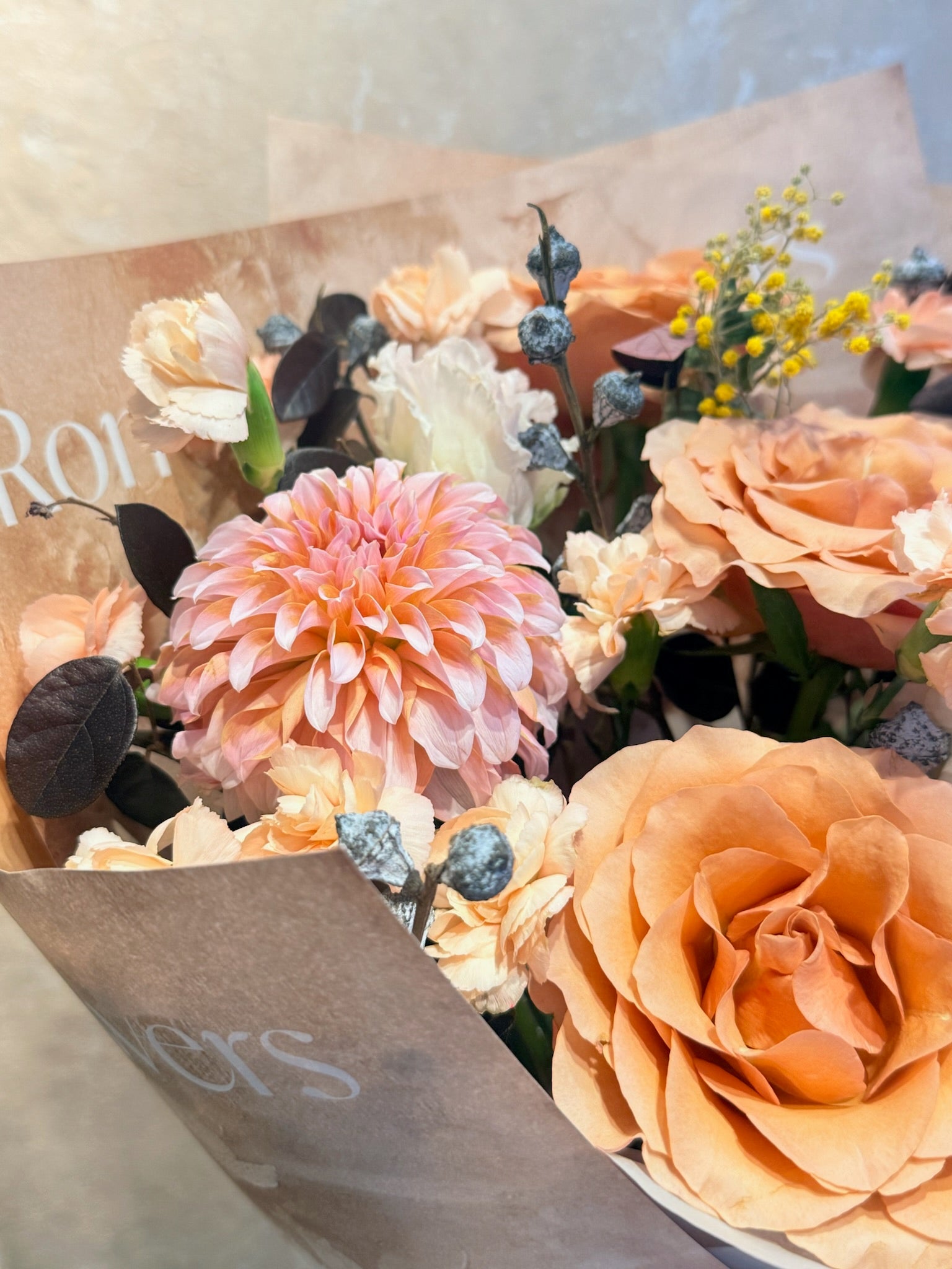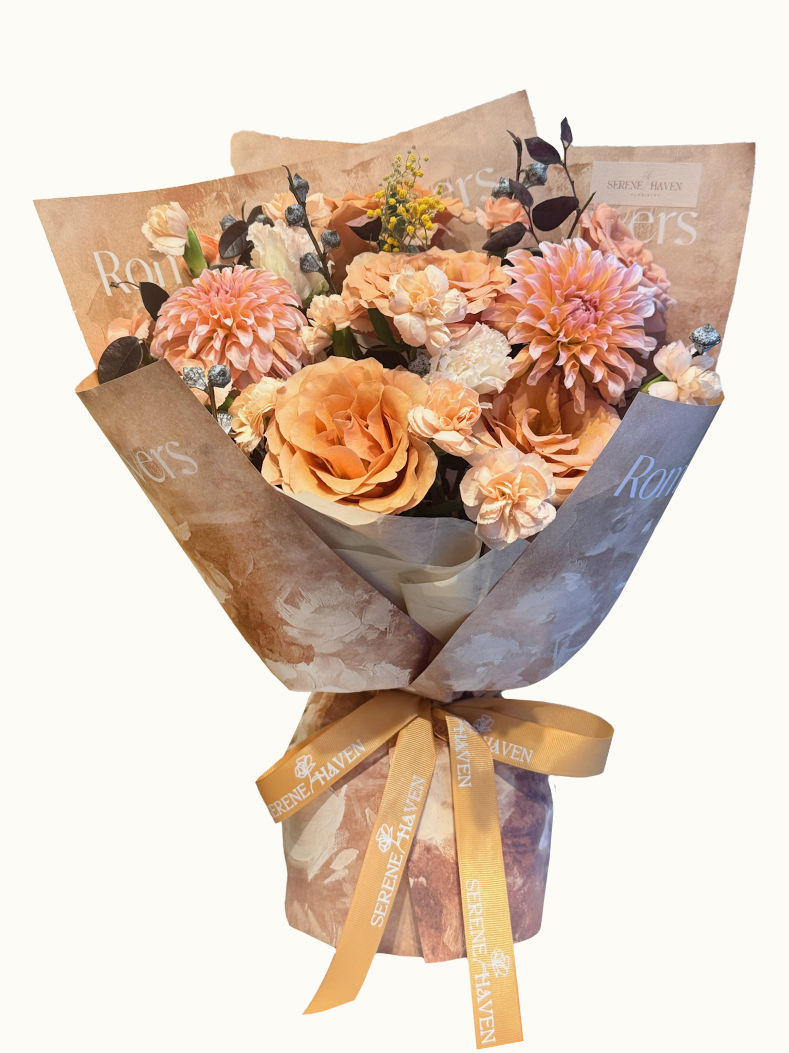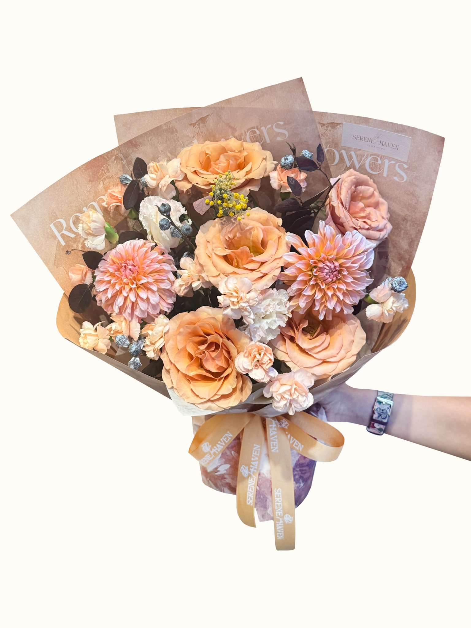 Bathed in the glow of a setting sun, Golden Haze gathers tender roses, dahlias, and blooms in sun-washed hues of peach and amber. Each petal is a whisper of warmth, comfort, and light - a gentle embrace wrapped in floral form. Ideal for birthdays, anniversaries, Mother's Day, or simply to say “you are cherished” without needing words.