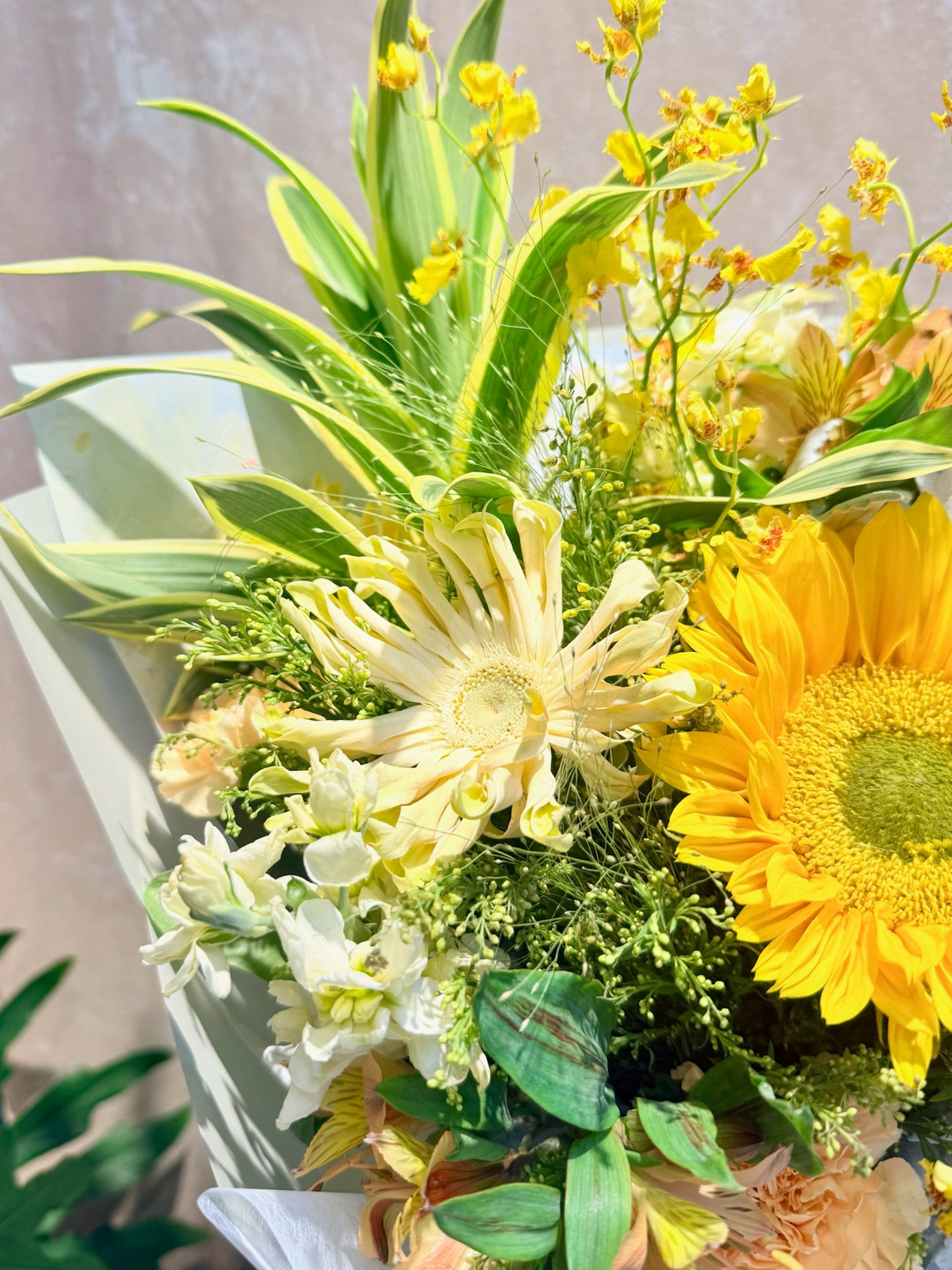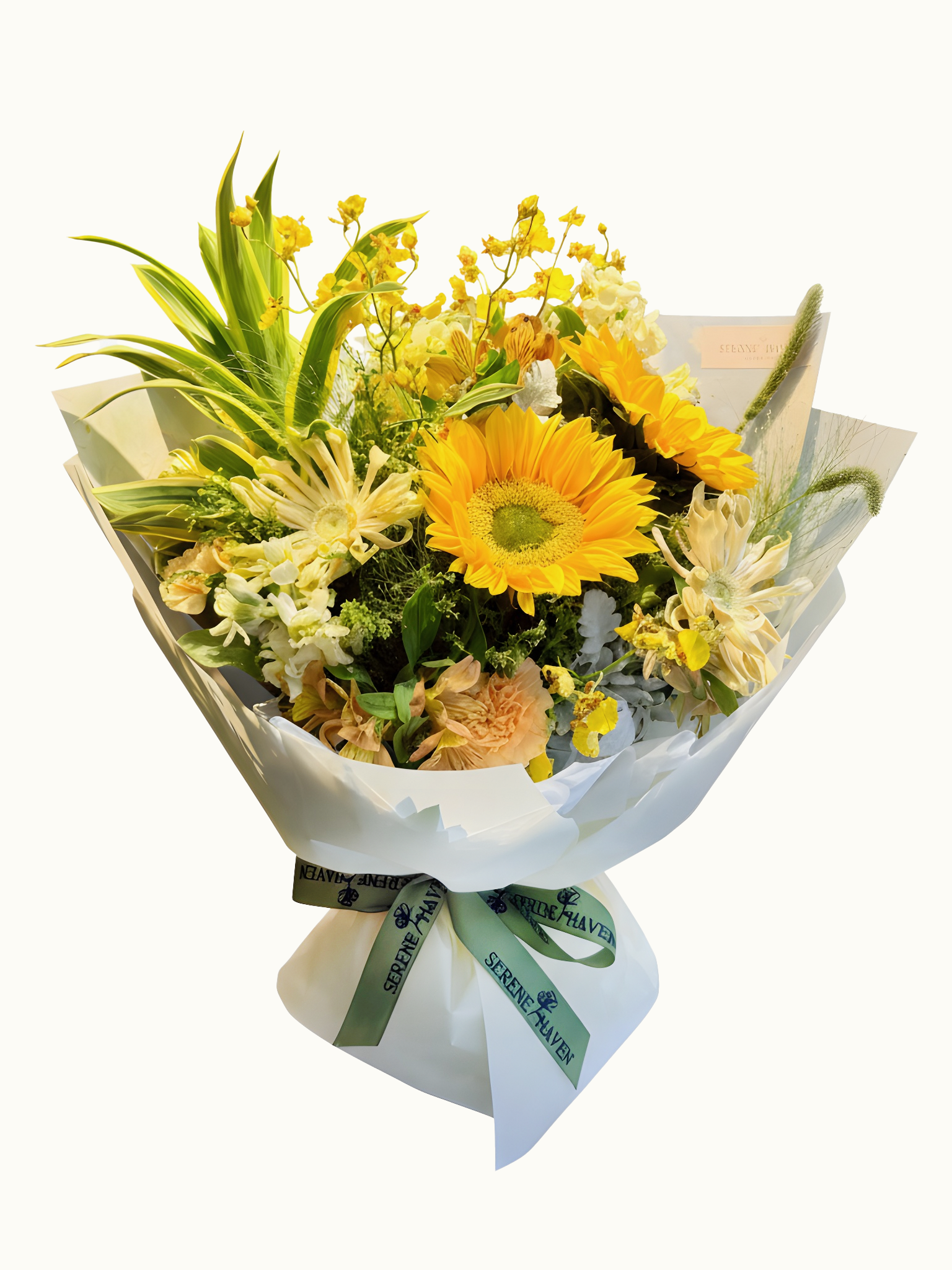 Golden Passage speaks to graceful transitions and quiet strength, making it a meaningful gesture for the graduate ready to step into their next chapter. Like a soft golden light guiding the way, this bouquet celebrates the balance of reflection and aspiration - a reminder that every ending carries the promise of something new.