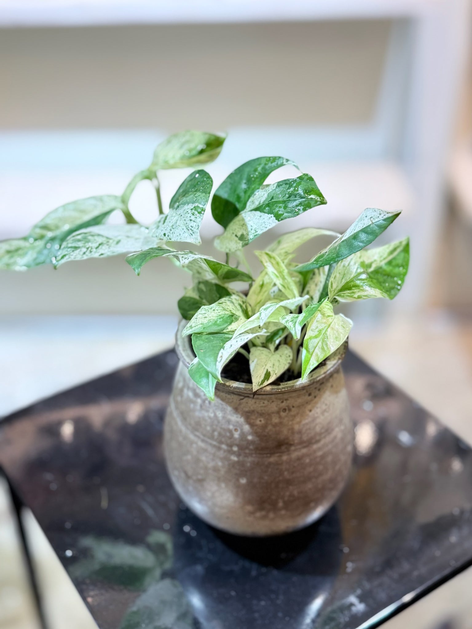 A gentle climbing companion, this variegated pothos flows with effortless grace. Its soft green-and-cream leaves symbolise flexibility, vitality, and ease - a daily reminder to grow at your own pace.