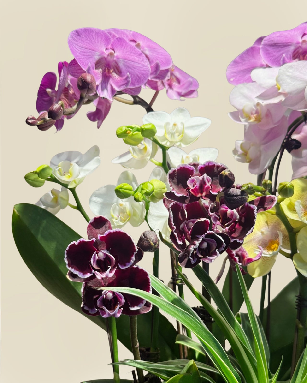 A lively composition of orchids in uplifting hues, created to celebrate new beginnings. Full of movement and colour, this arrangement brings warmth, joy, and festive energy into any space.