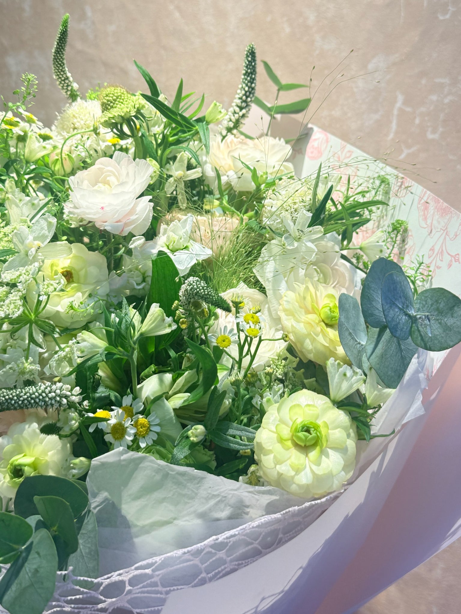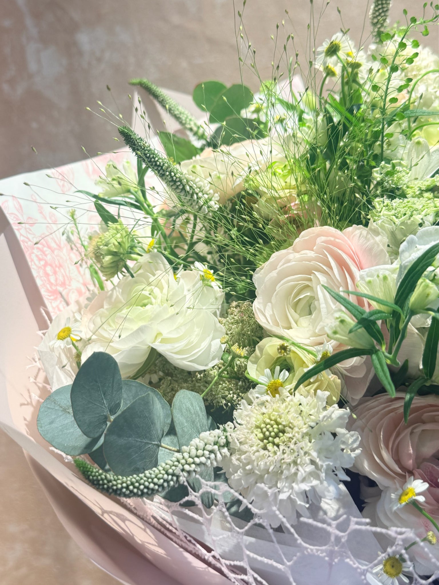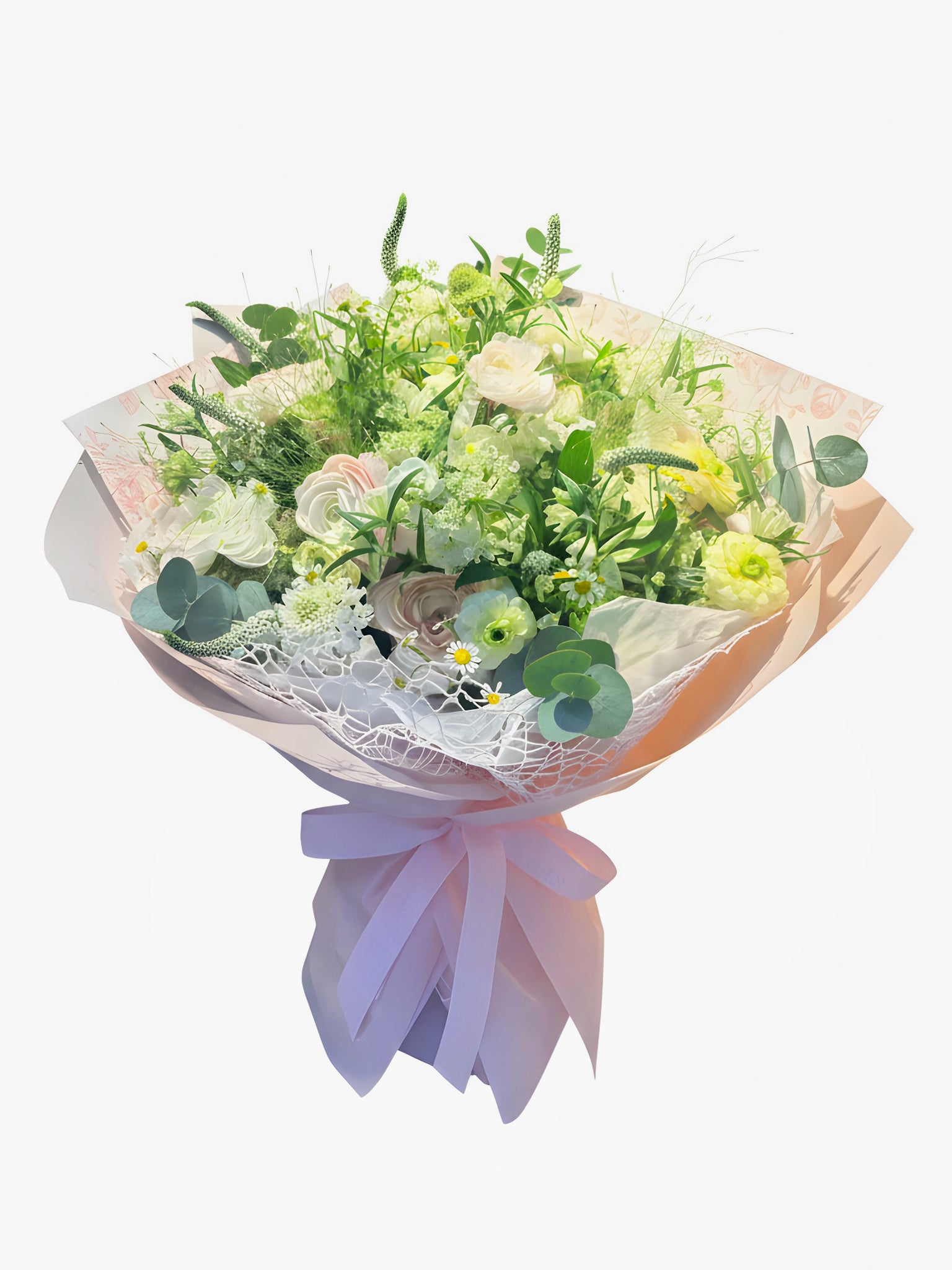 Delicate, soft, and full of lush greenery, this bouquet is a breath of fresh air. Inspired by wildflowers and countryside charm, it brings the feeling of a peaceful meadow into your home. Perfect for celebrating new beginnings, birthdays, or expressing appreciation, it offers a gentle, whimsical beauty. Its fresh, organic style is both modern and romantic, making it suitable for any occasion that calls for a tender touch.