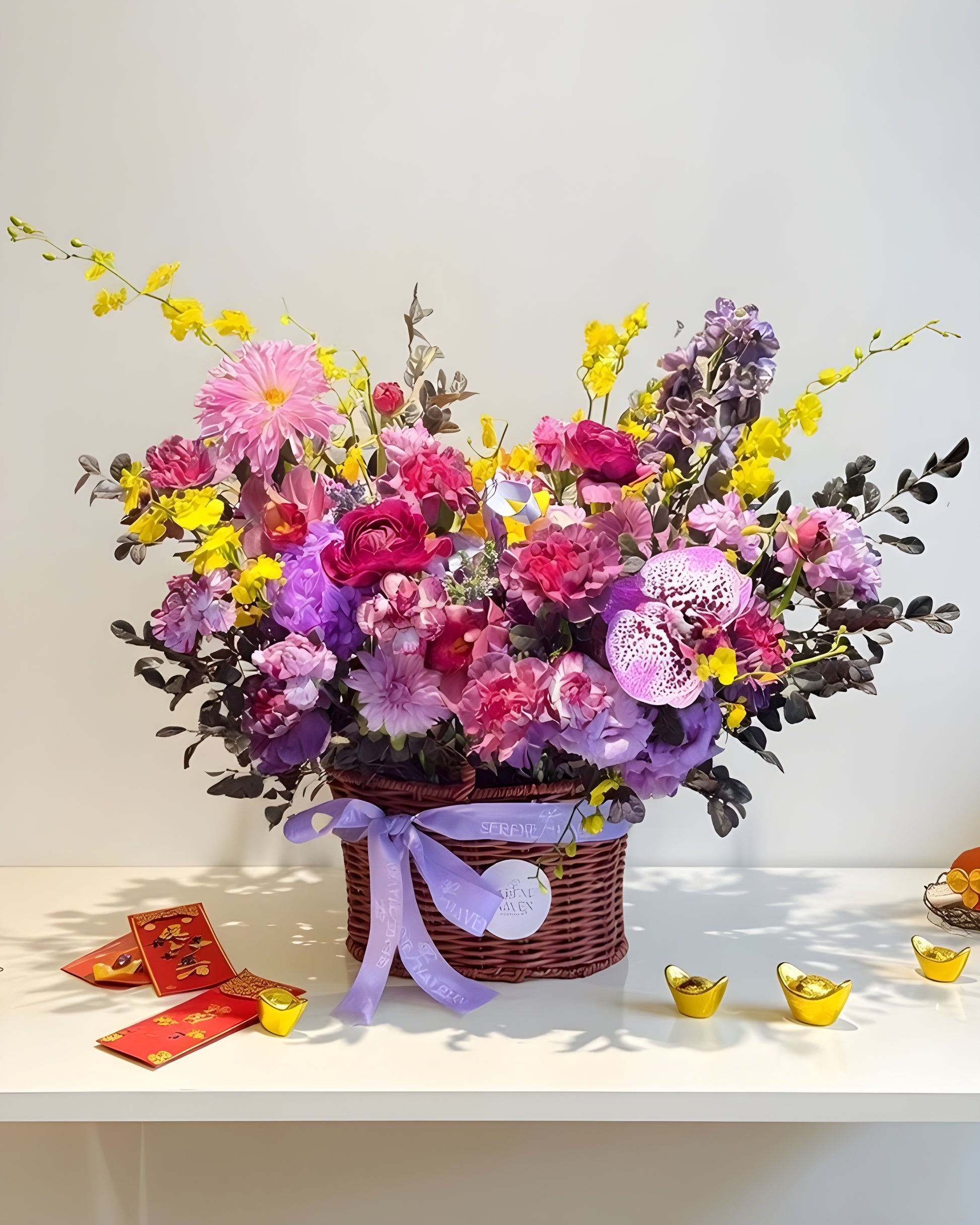 Designed to celebrate prosperity, renewal, and joyful beginnings, this Chinese New Year flower basket brings together vibrant seasonal blooms in a harmonious blend of festive colours. Thoughtfully arranged in a woven basket, it adds warmth, elegance, and auspicious energy to any space.