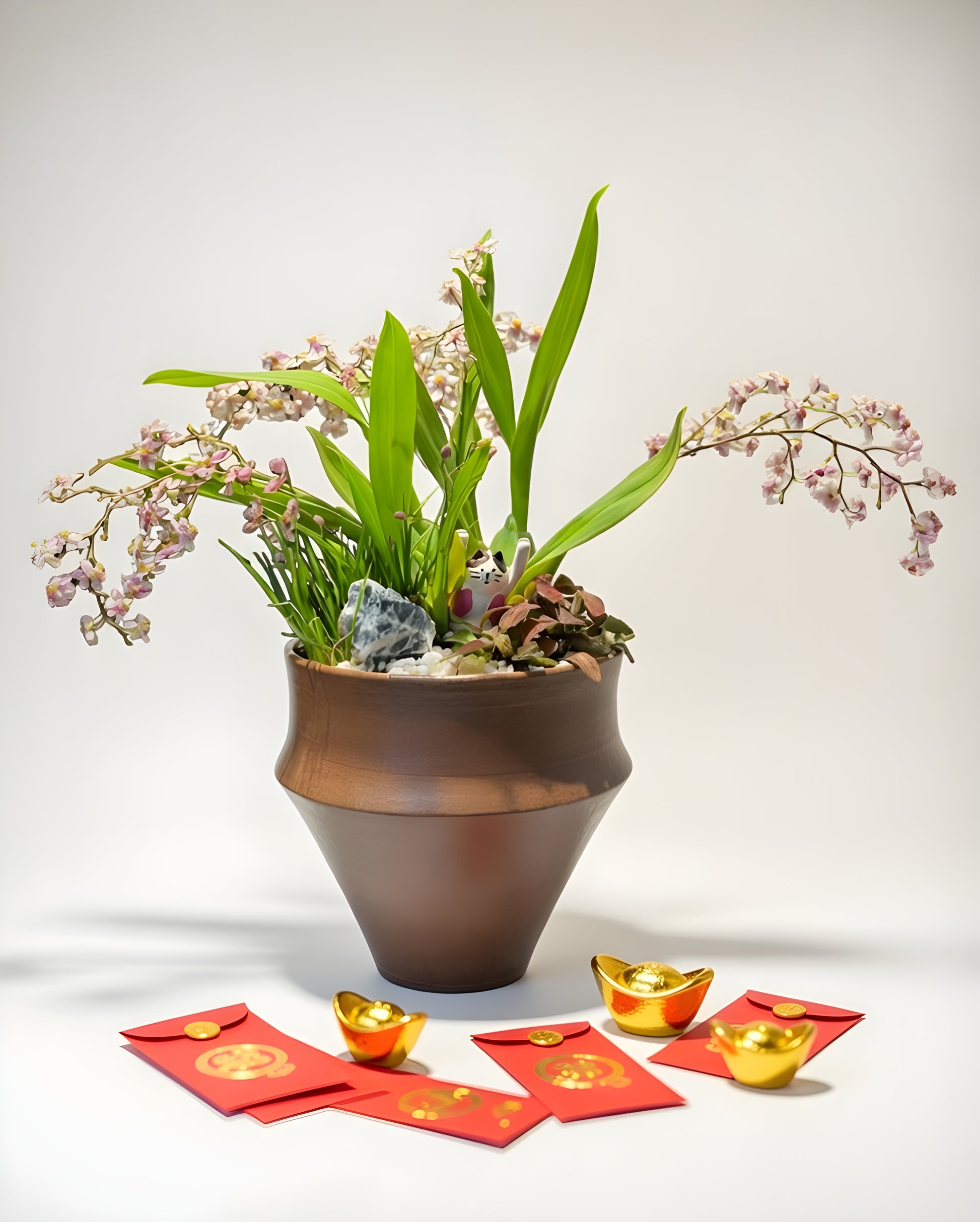 A refined orchid arrangement designed for subtle celebration. With soft blooms and a balanced silhouette, this piece brings quiet prosperity and gentle elegance to workspaces or intimate home corners.