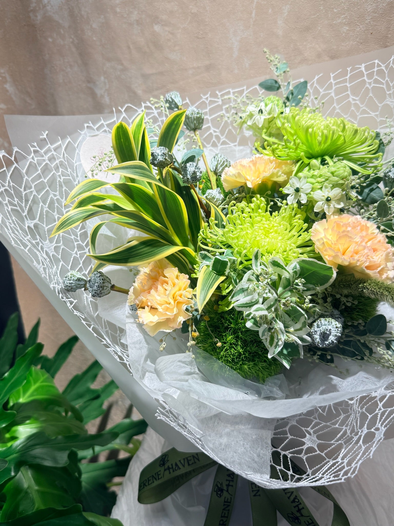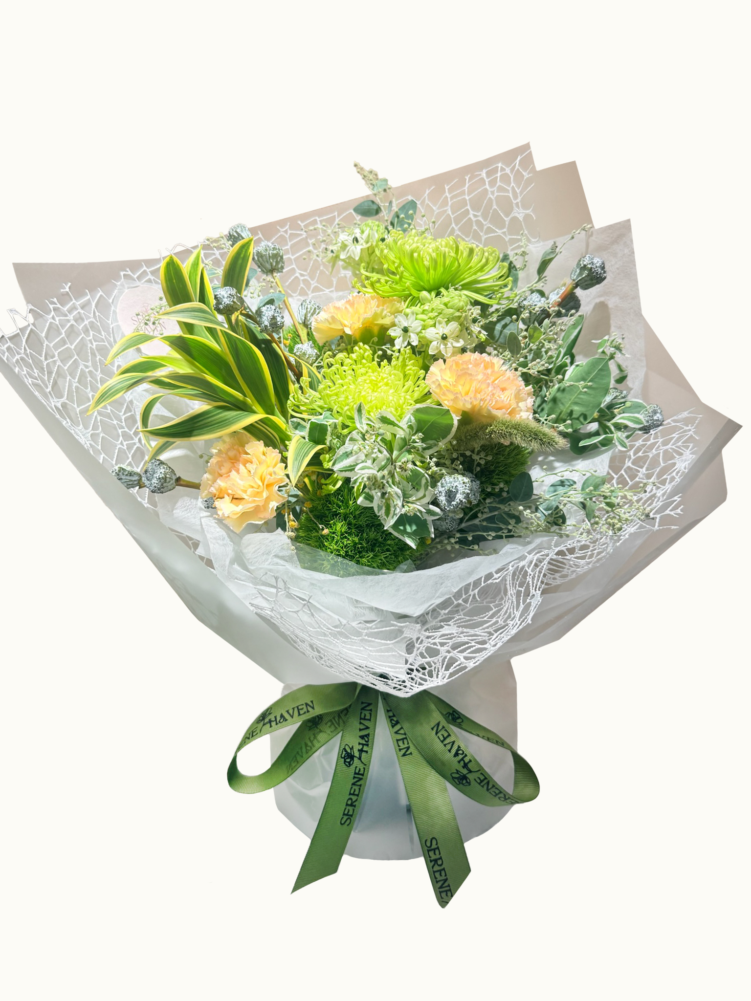 Eucalyptus Delights is a tranquil blend of soft greens and creamy pastels, designed to soothe the soul and uplift the spirit. With its elegant textures and fresh, natural palette, this bouquet captures the quiet beauty of nature’s gentlest moments.