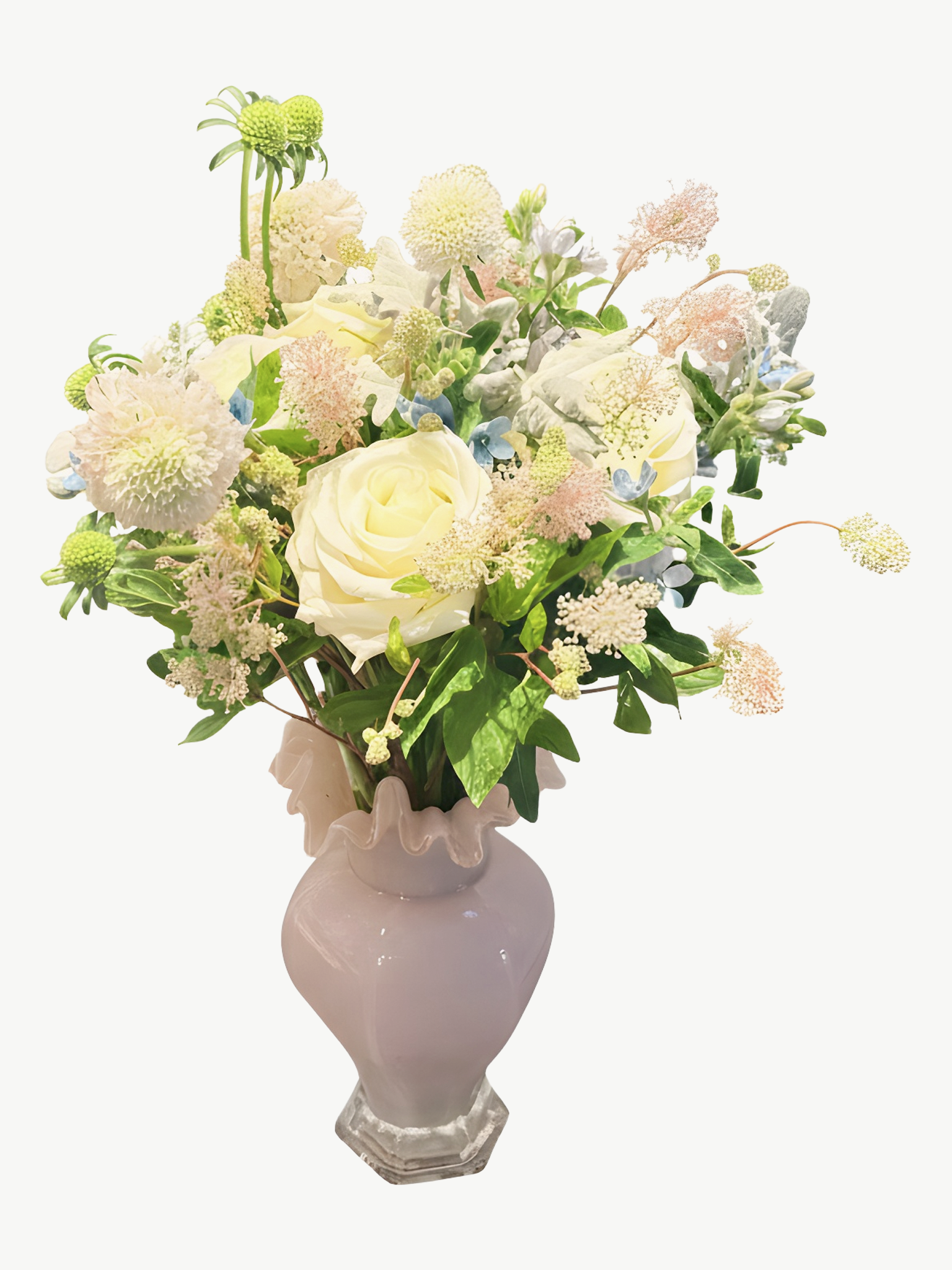 Ethereal and understated, this arrangement brings a breath of calm wherever it’s placed. Designed to feel like a pause in a busy day, its soft lines and gentle palette make it perfect for workspaces, bedside tables, or reading nooks. Whether given as a gift or kept as a personal moment of peace, this vase whispers serenity and effortless beauty into its surroundings.