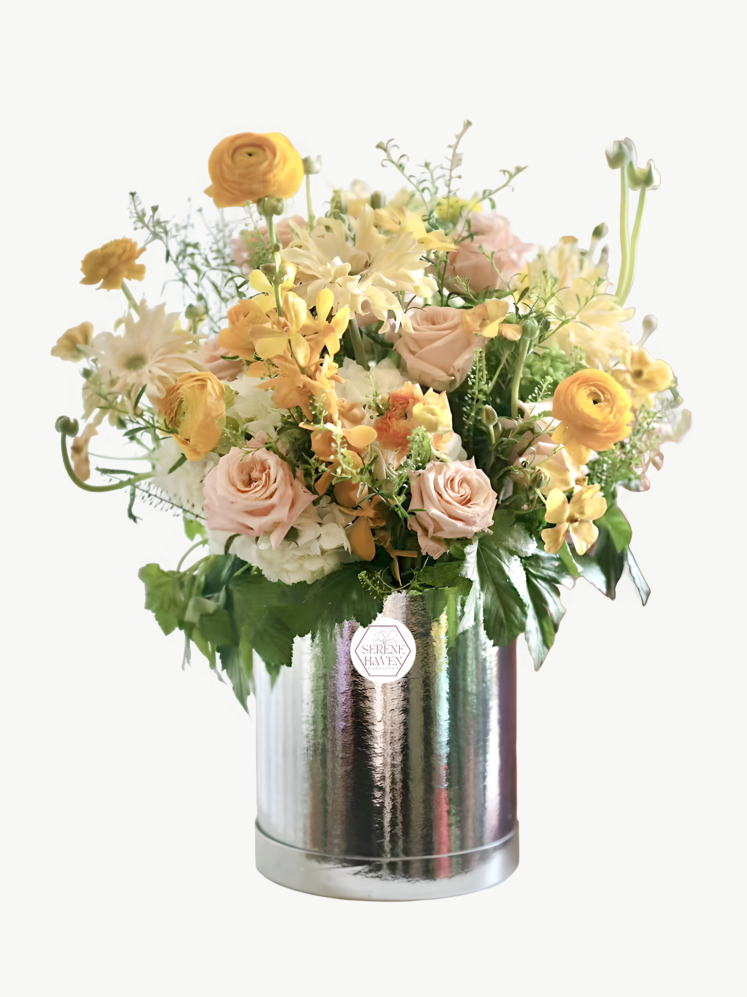 Delicate yet cheerful, this bouquet brings together soft sunshine tones and graceful elegance - like a warm morning hug wrapped in petals. With its sweet, soothing palette, Sunbeam Hug is a joyful choice for so many occasions: Mother’s Day, a thoughtful “I miss you,” or a spontaneous surprise for a friend who needs a little light.