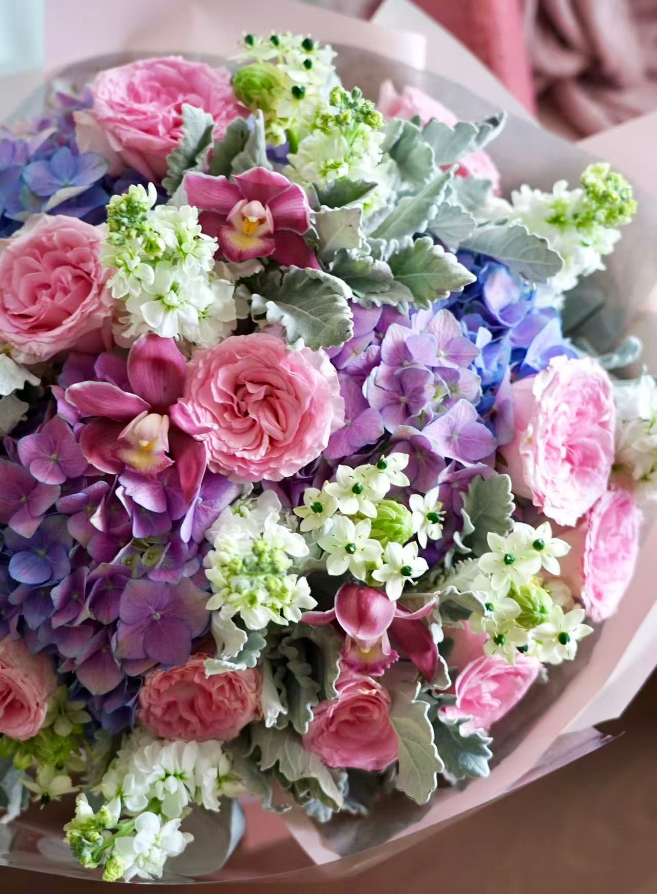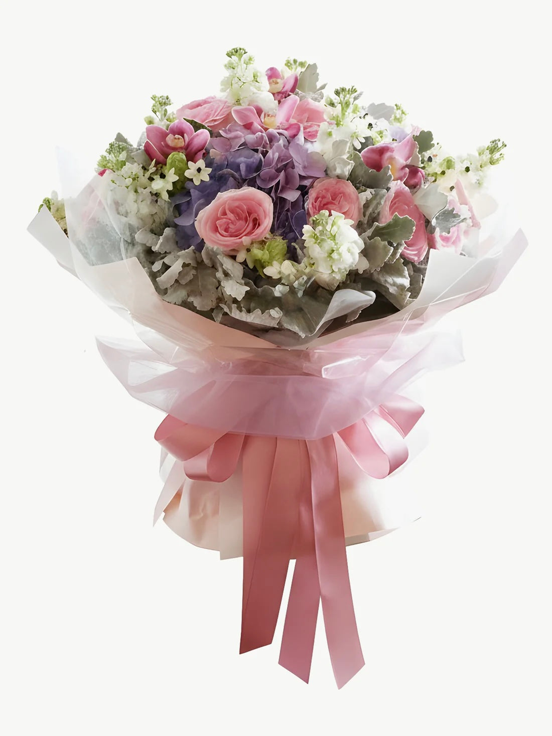 Delicate, dreamy, and full of charm, this bouquet feels like a gentle embrace. Its soft tones and graceful composition offer a sense of calm and care, making it a meaningful gift for anyone who appreciates subtle beauty.