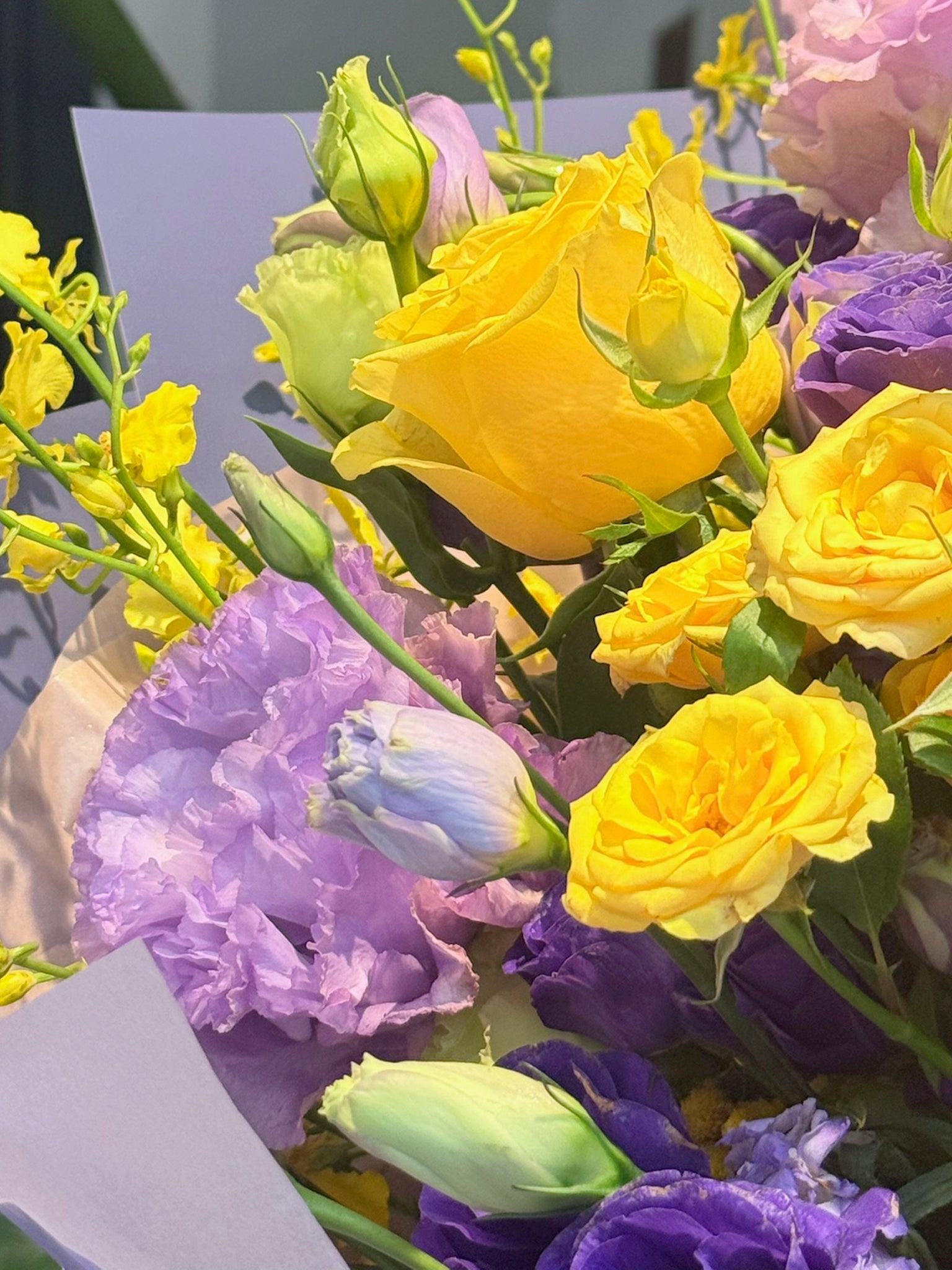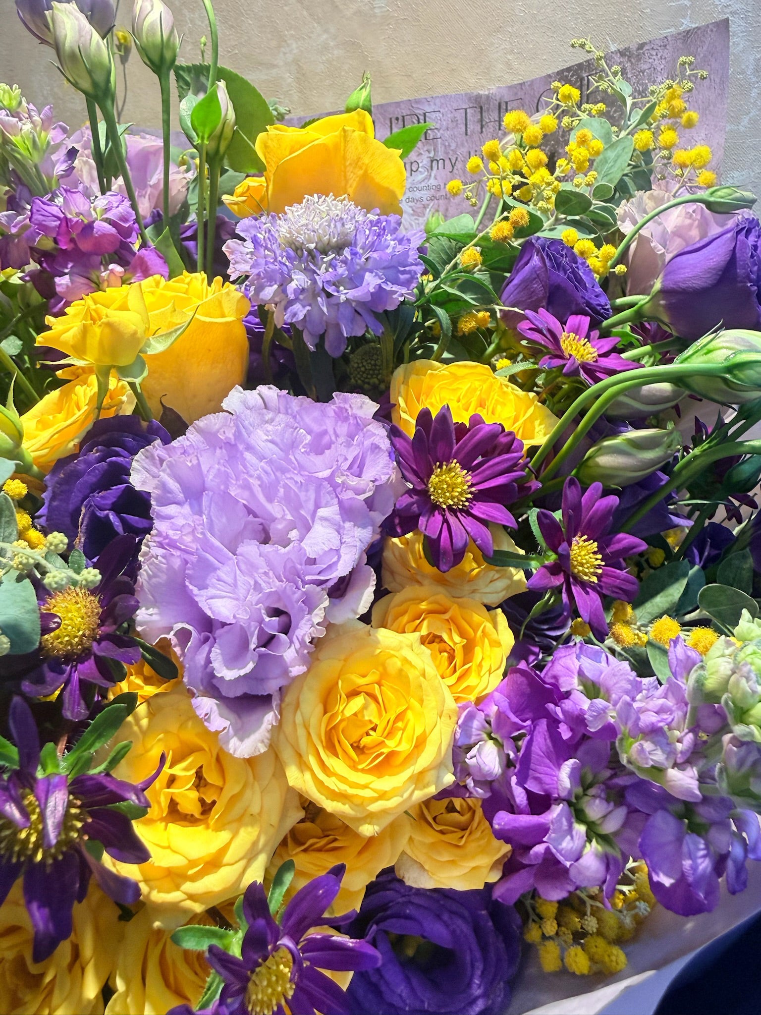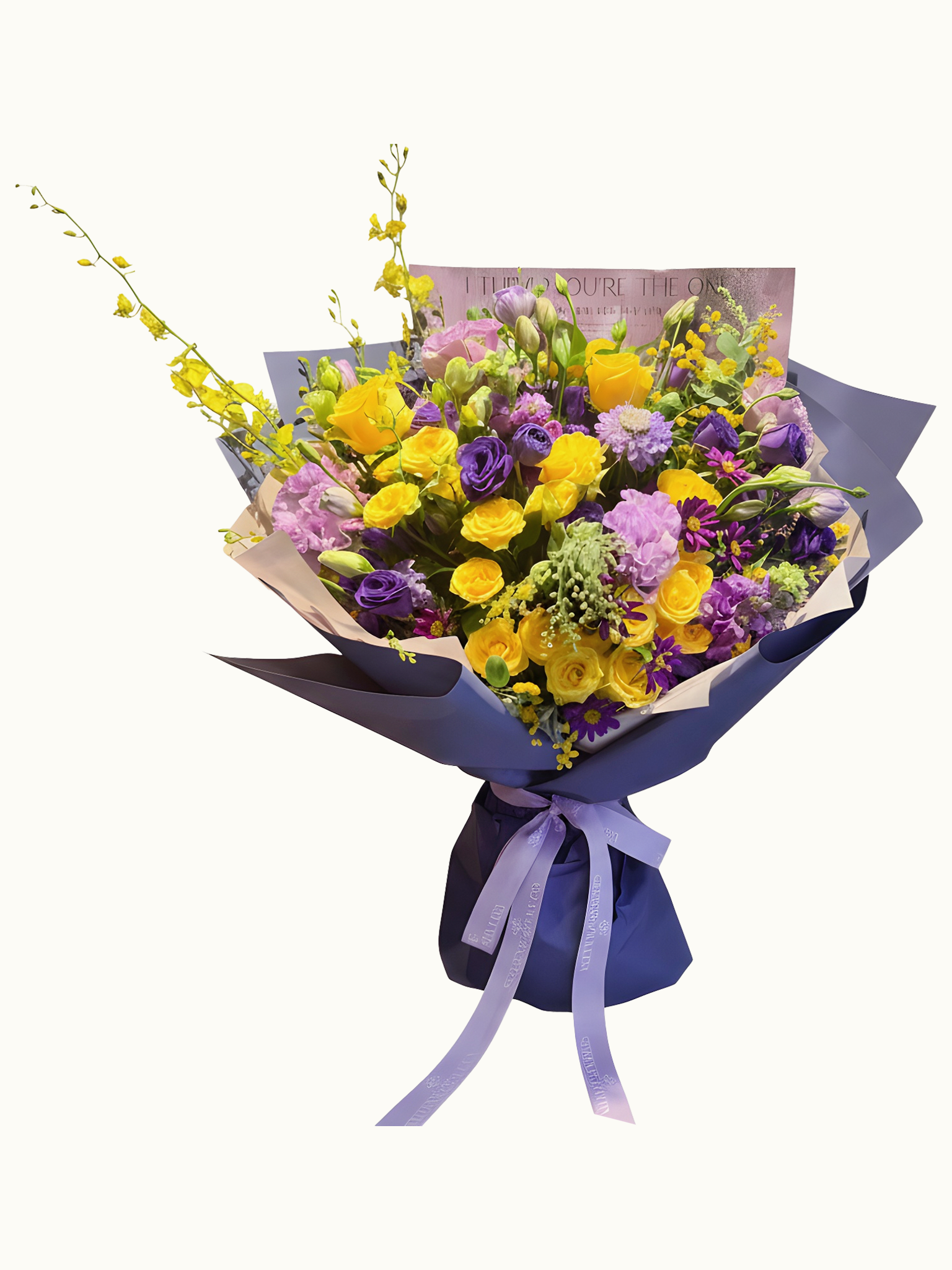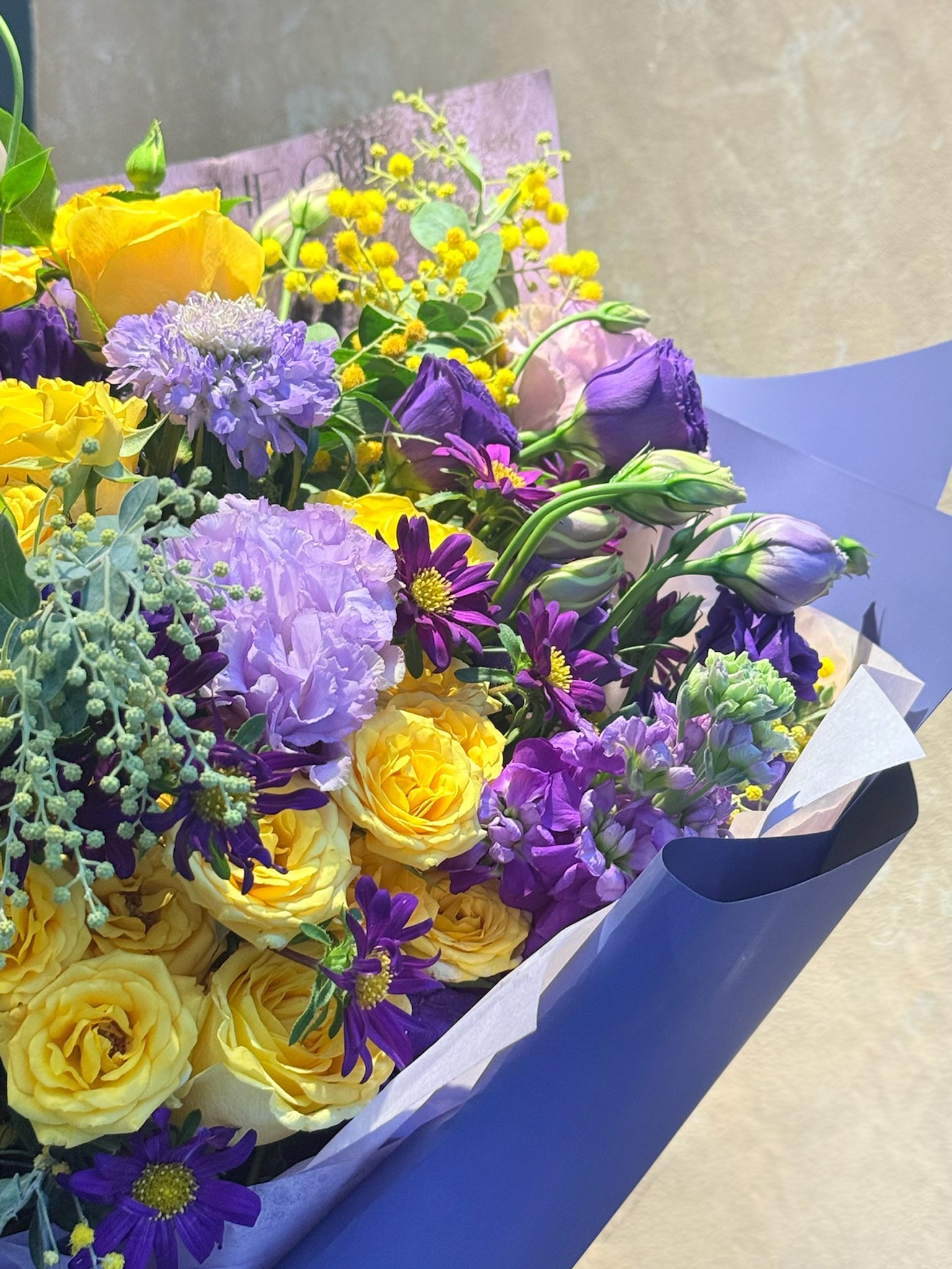 A vivid harmony of deep purples and golden warmth, this bouquet feels like golden moment captured in bloom. Bold yet composed, it speaks to joy, gratitude, and moments that deserve to be remembered.