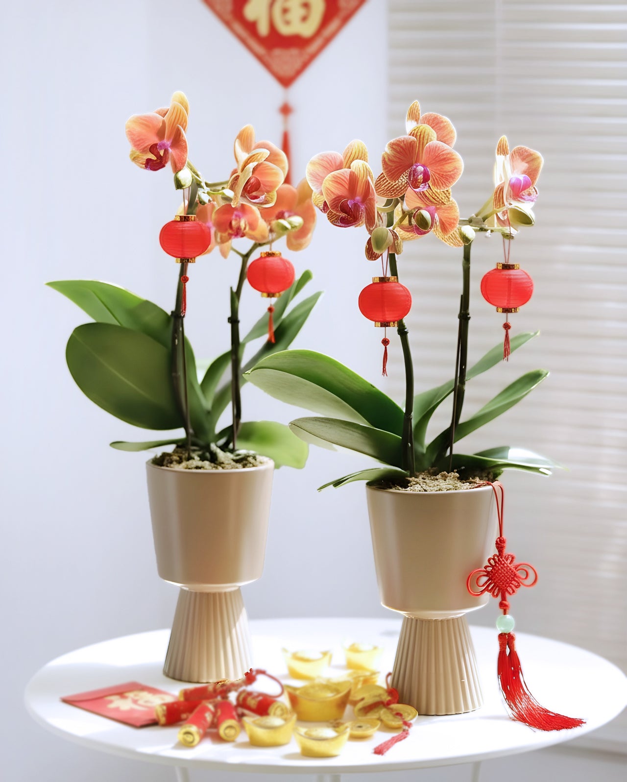Welcome the season with elegance and warmth. This vibrant orchid is accented with festive red lanterns and set in a sleek modern pot - a perfect way to celebrate Chinese New Year with style. Ideal for gifting or adding a joyful touch to your home, it brings blessings of luck, harmony, and good fortune. Also suitable for birthdays, housewarmings, and other special occasions. A simple yet meaningful floral statement to brighten any space.