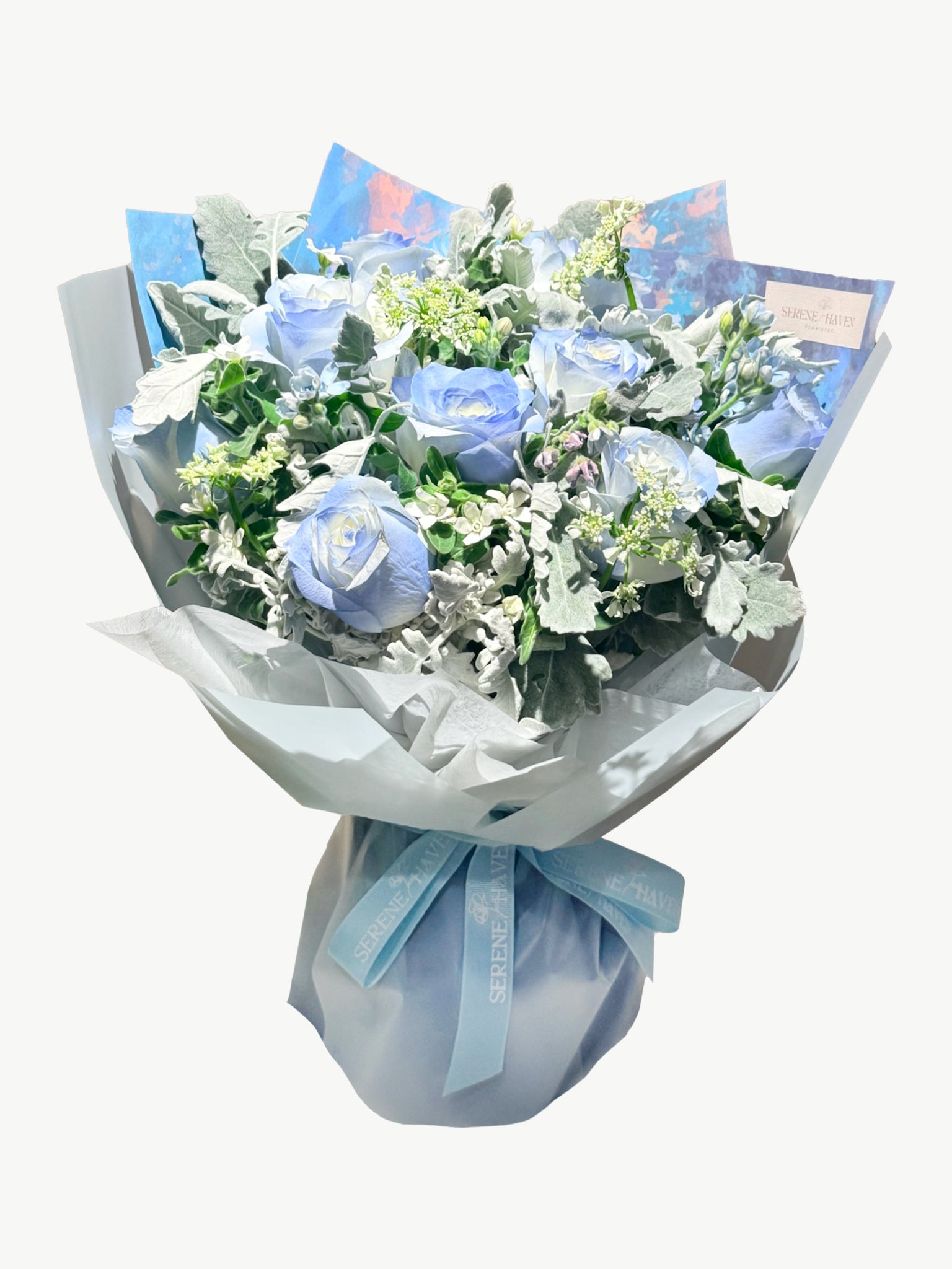 Cool, calming, and elegant - this bouquet captures the serenity of a quiet sky. A beautiful gesture for birthdays, thank-yous, romantic surprises, or simply to say "I'm thinking of you." Its soft blue palette evokes peace and timeless charm for any heartfelt occasion.